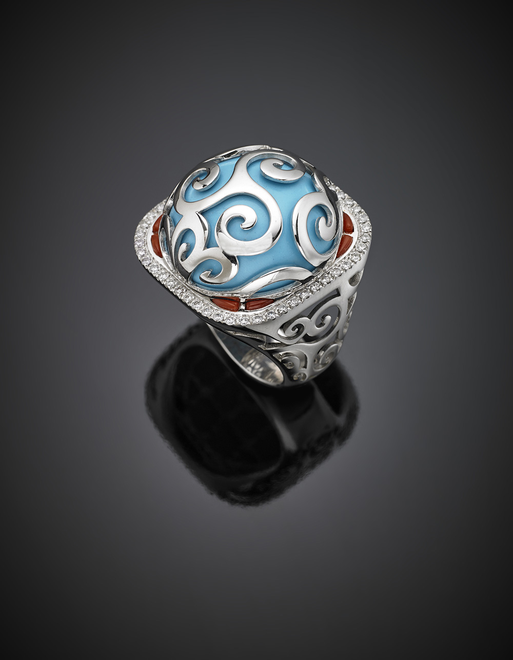 *DI GREGORIOAnello in oro bianco con pasta di turchese, corallo e diamanti a...