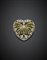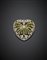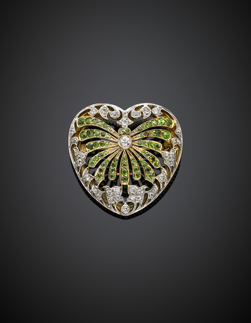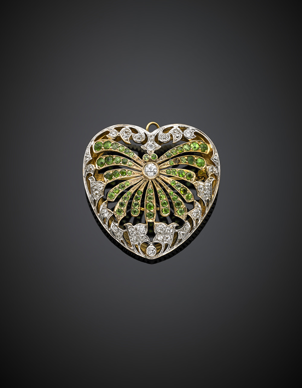Pendente traforato a forma di cuore in oro giallo e bianco con diamanti per complessivi ct. 1 circa rifinito con peridoti e paste vitree verdi, g 12,49, lungh. cm 4, largh. cm 3,9 circa. (mancanze)