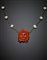 Catena in oro giallo e perle irregolari rifinita in centro con sole scolpito in corallo rosso arancione, g 35,79, lungh. cm 55,5 circa.