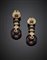 Bi-coloured gold diamond onyx and cabochon ruby pendant earclips, synthetic ruby wheel in the pendants, diamonds in all ct. 1 circa and cabochon rubies in all ct. 4.50 circa, g 41.75, length cm 5.30 circa.