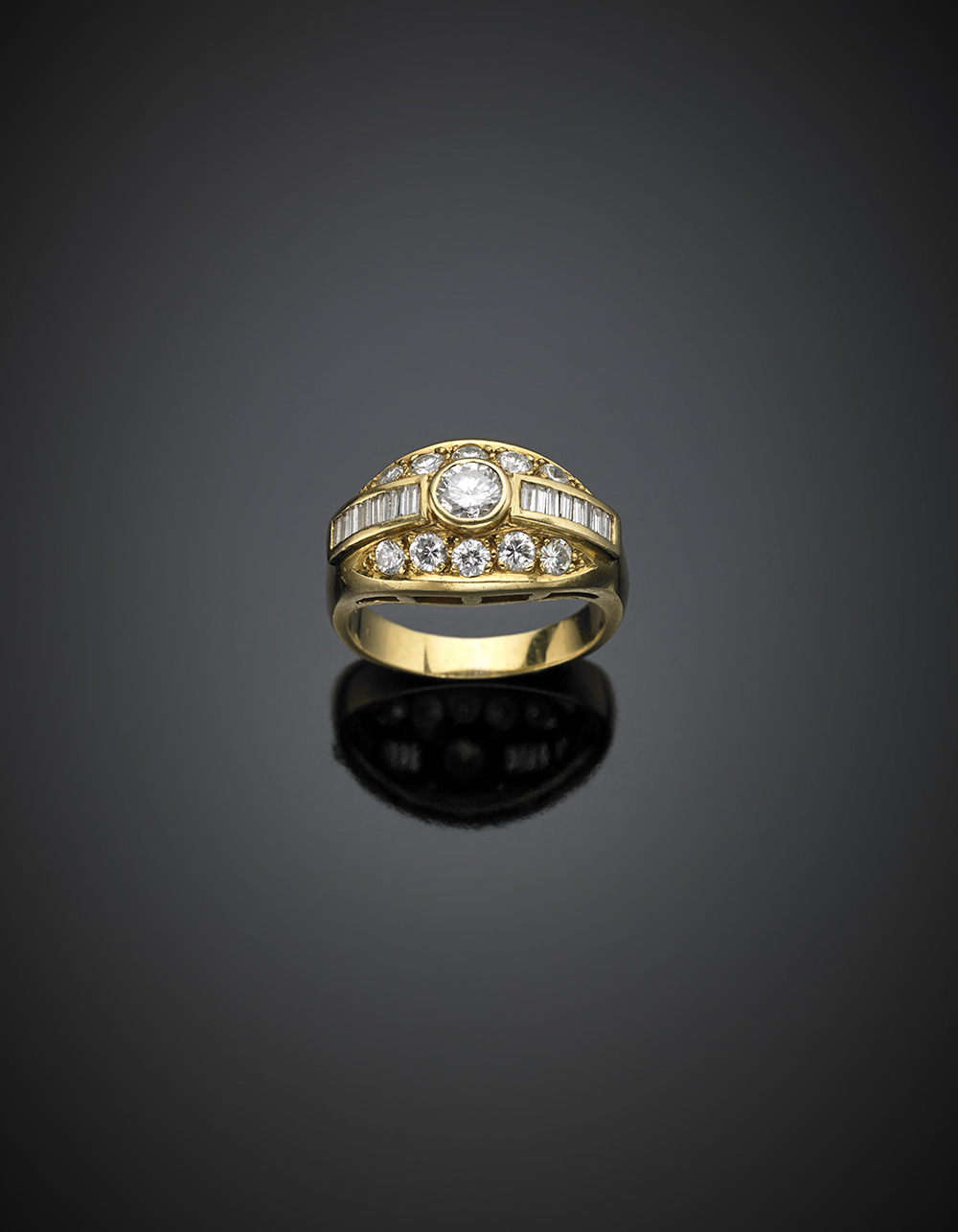 Anello in oro giallo con diamanti rotondi e a baguette per complessivi ct. 1...