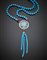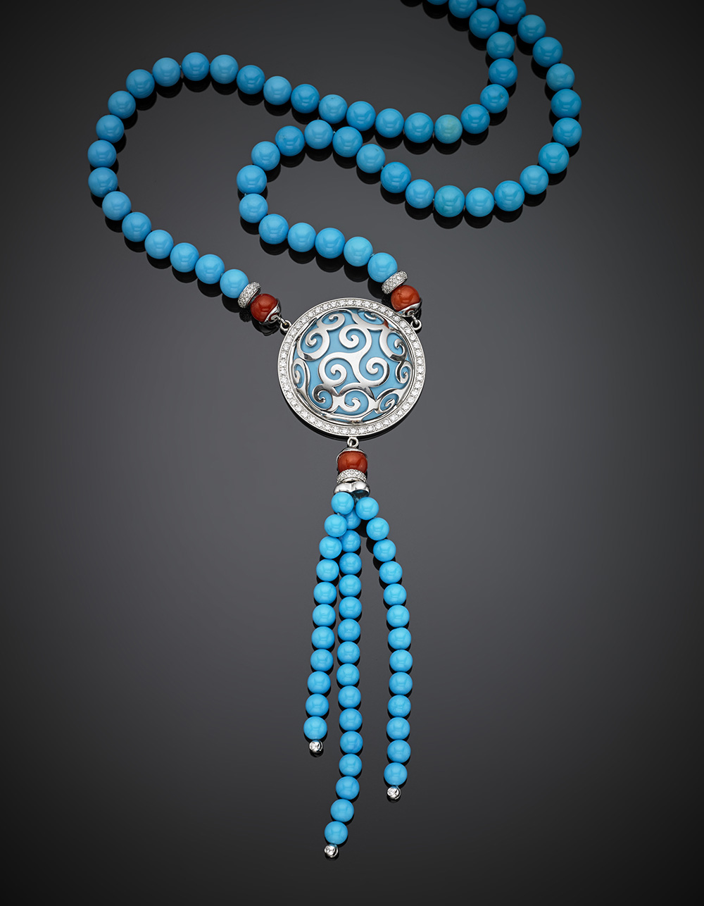 Collana con turchese naturale stabilizzato con distanziatori e medaglione in oro bianco, diamanti e pasta di turchese, dettagli di pasta di corallo, rifinito con nappa, g 106,16, lungh. cm 85 circa. Marcato 2297 MI. Con garanzia originale