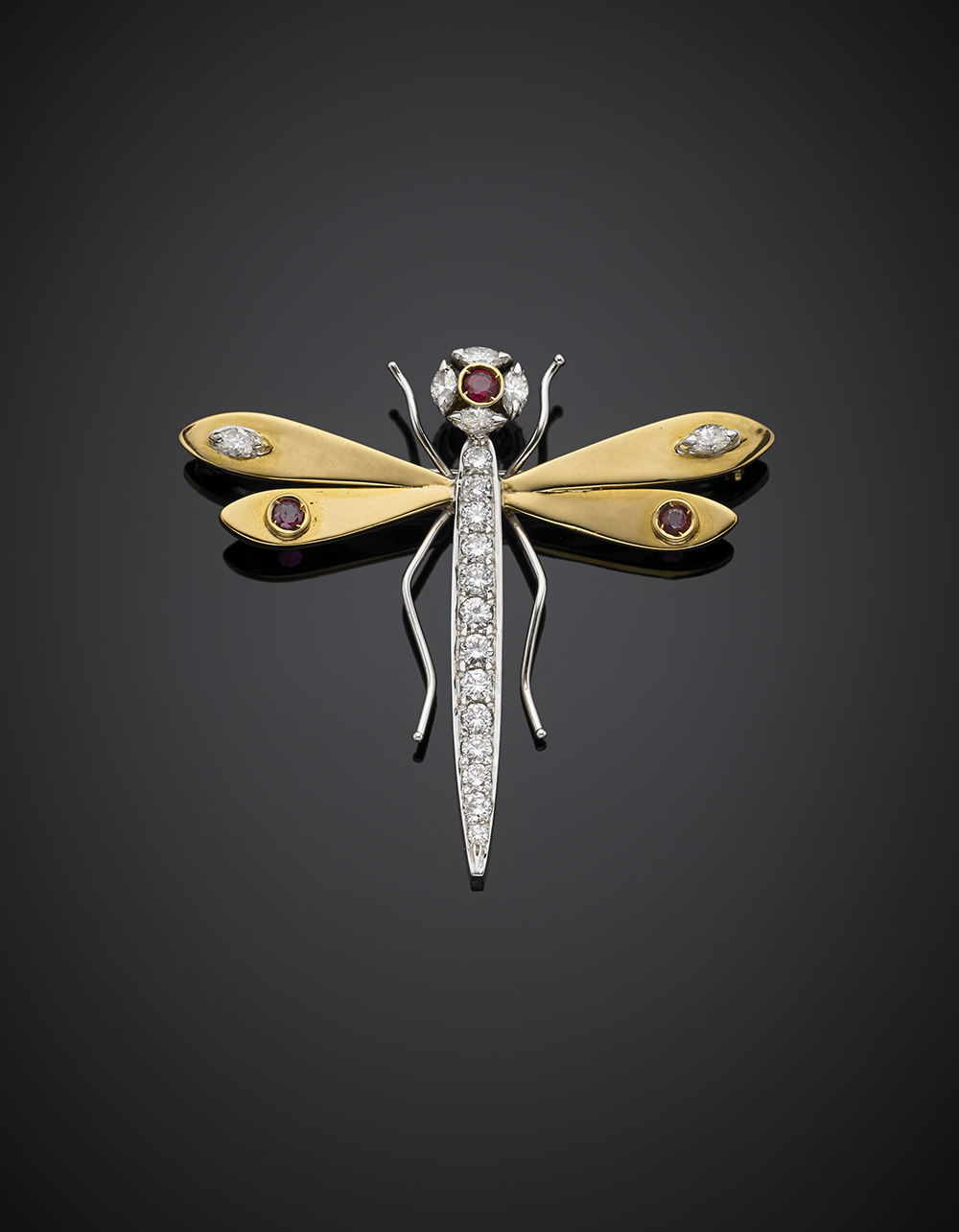 Broche a guisa di libellula in oro bianco e giallo con diamanti per complessivi ct. 2,20 circa e rubini per complessivi ct. 0,50 circa g 12,7, lungh. cm 5,30, largh. cm 6 circa.