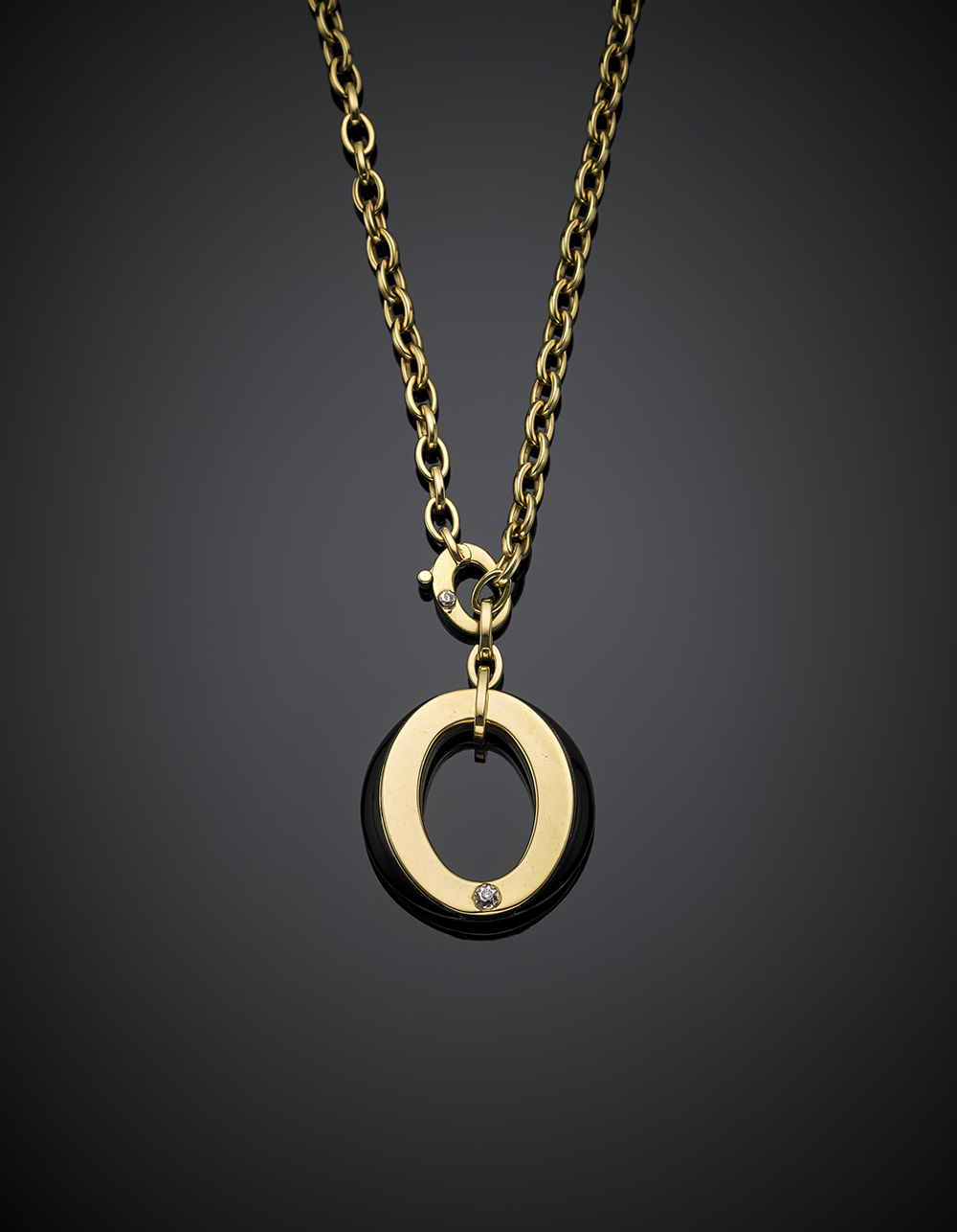 Collana regolabile con pendente in oro giallo e onice rifinito in diamanti, g 45,26, lungh. cm 65 circa. Firmato CHIMENTO, 408 VI.