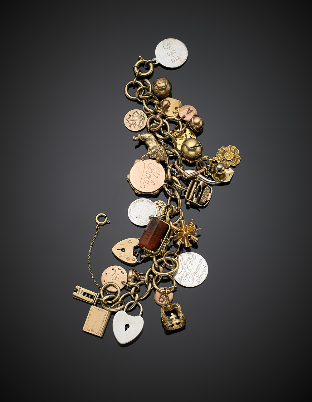Yellow 9K gold bracelet with silver and gold charms of various shapes and gold titles, one charm as a book with a Ruben Dario spanish poem, g 87.89, length cm 21 circa. On the charms 373 VA, 1572 MI, 749 MI. (defects)