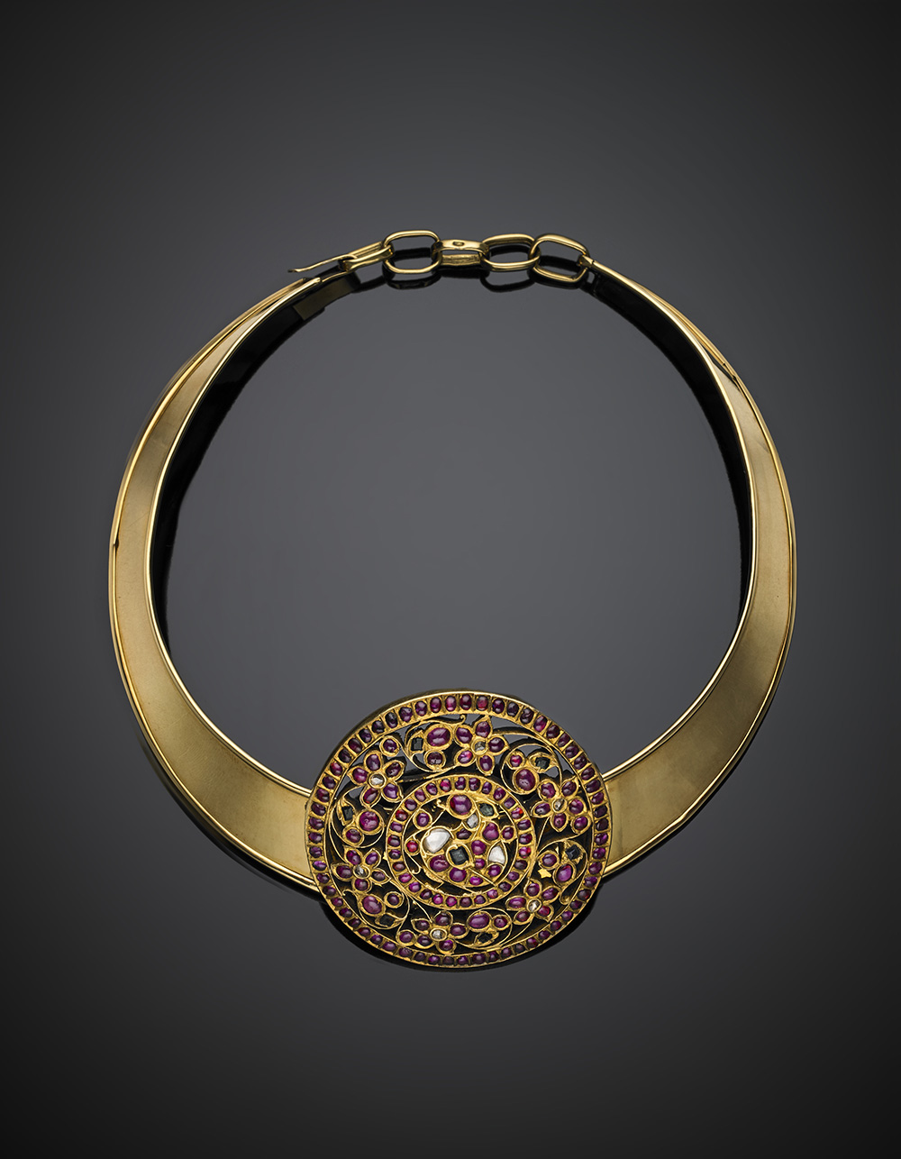 Yellow gold rigid necklace with "indian" central/brooch accented with cabochon synthetic rubies green and colourless gems, g 75.28, diam. cm 12. Signed on the necklace MISANI.