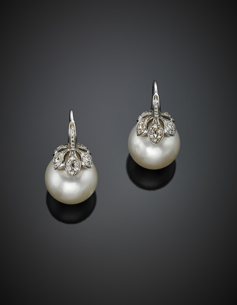 White gold mm14 South Sea pearl and diamond earrings, g 12.3, length cm 2.7 circa.