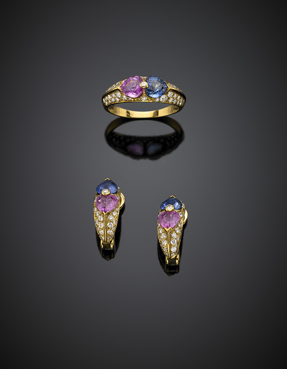 Demi parure in oro giallo composta da orecchini e anello mis 13.5/53.5 con zaffiri a cuore per complessivi ct. 3 circa, rifinita in diamanti per complessivi ct. 1 circa, complessivi g 8,01.