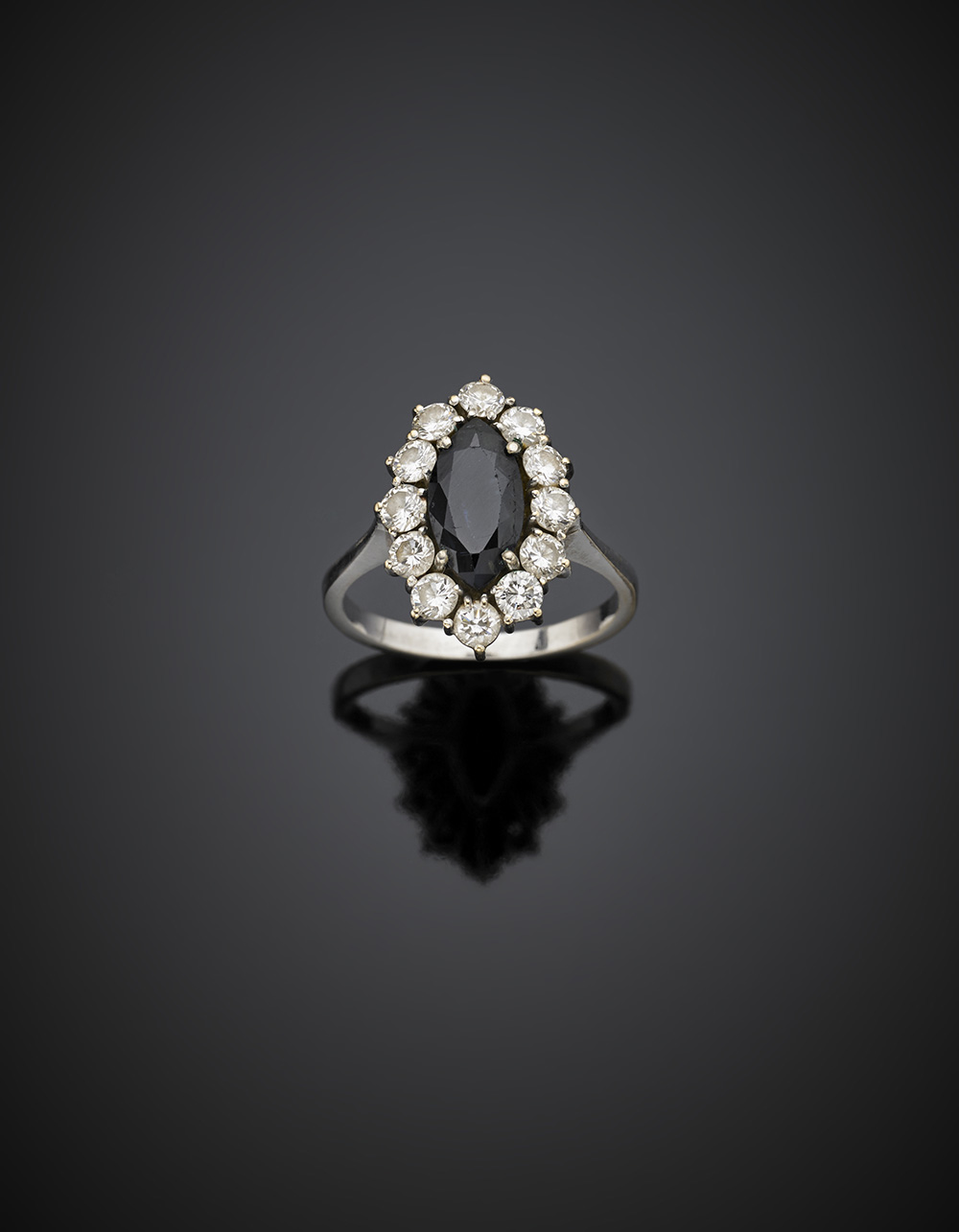 Marquise ct. 1.80 circa sapphire round diamond white gold cluster ring, diamonds in all ct. 1 circa g 4.02 size 13/53.