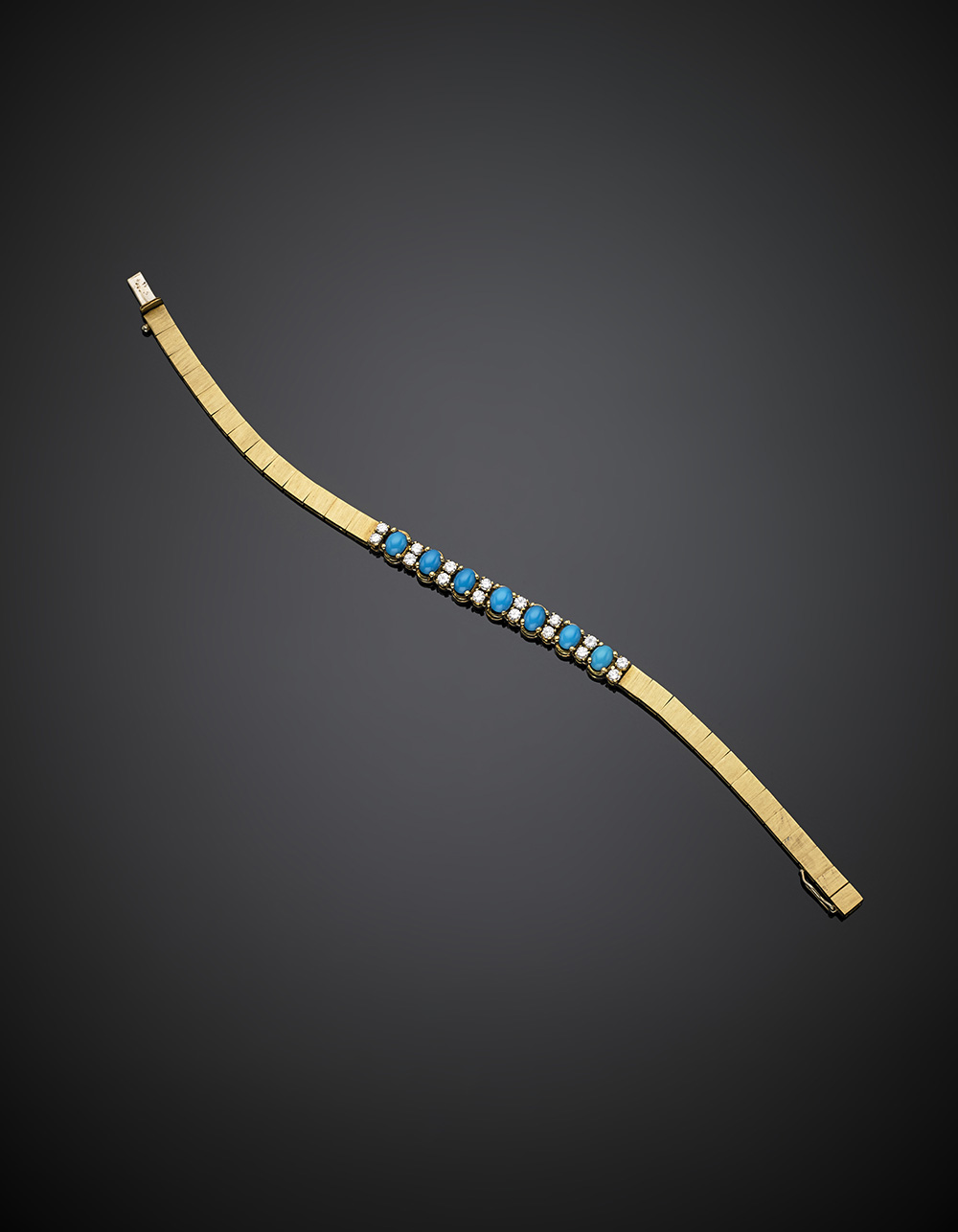 Bracciale modulare in oro giallo con turchesi e diamanti per complessivi ct. 0,80 circa, g 18,65, lungh. cm 18 circa.