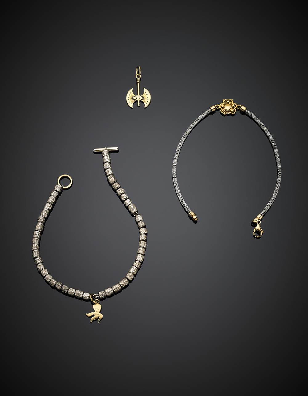 Due bracciali di cui uno DODO in argento, acciaio e oro giallo lungh. cm 19.5/18.5 e un pendente a guisa di ascia in oro giallo 585/1000, lordi complessivi g 18,04. Un bracciale marcato 351 MI, DODO.