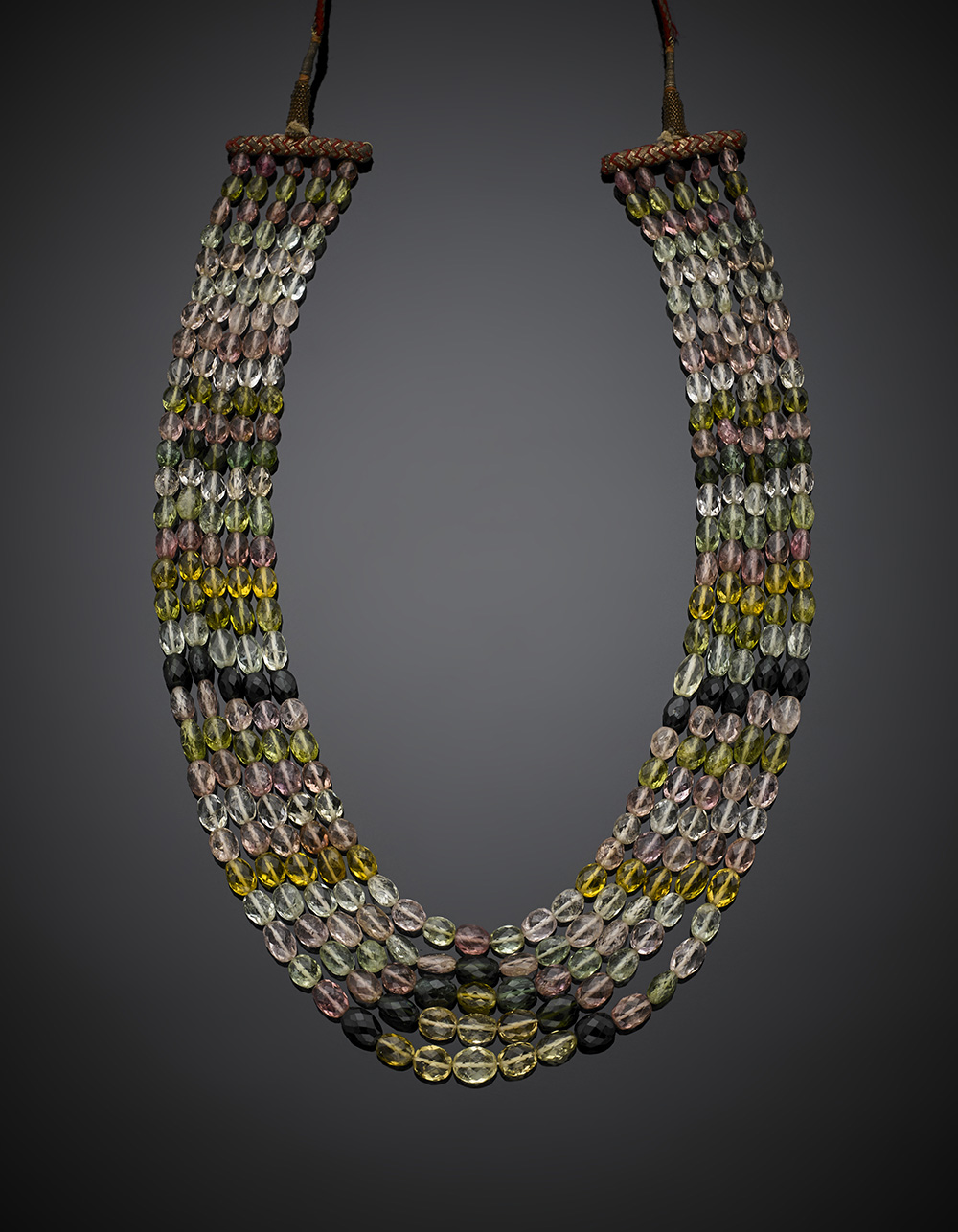Collana a cinque fili a scalare in tormaline e peridoti a briolette di varie sfumature, lungh. primo filo interno cm 48, g 134,80.