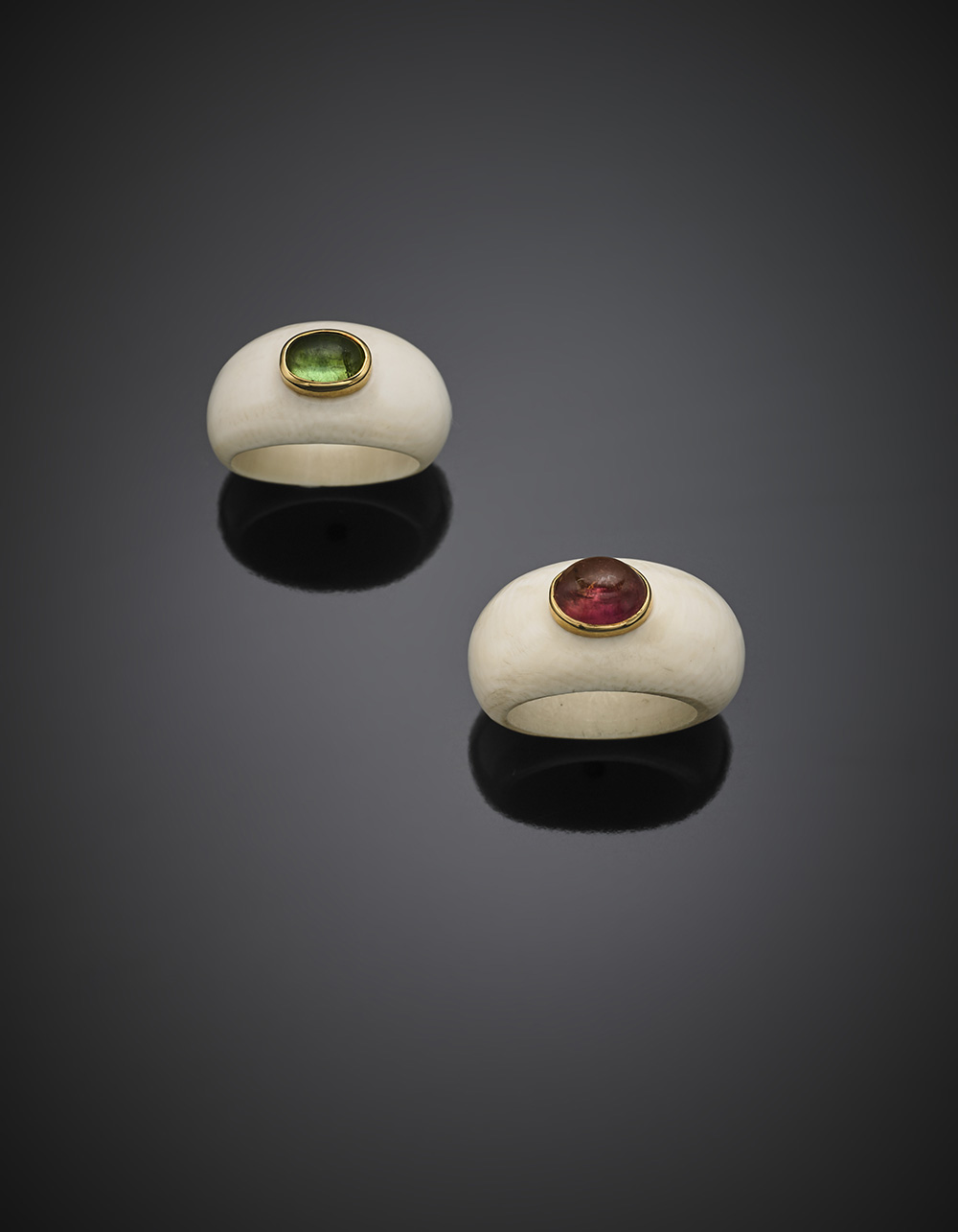 Due anelli in osso, pasta vitrea verde e tormalina cabochon, dettagli in oro giallo, complessivi g 6,47 misura 11/51.