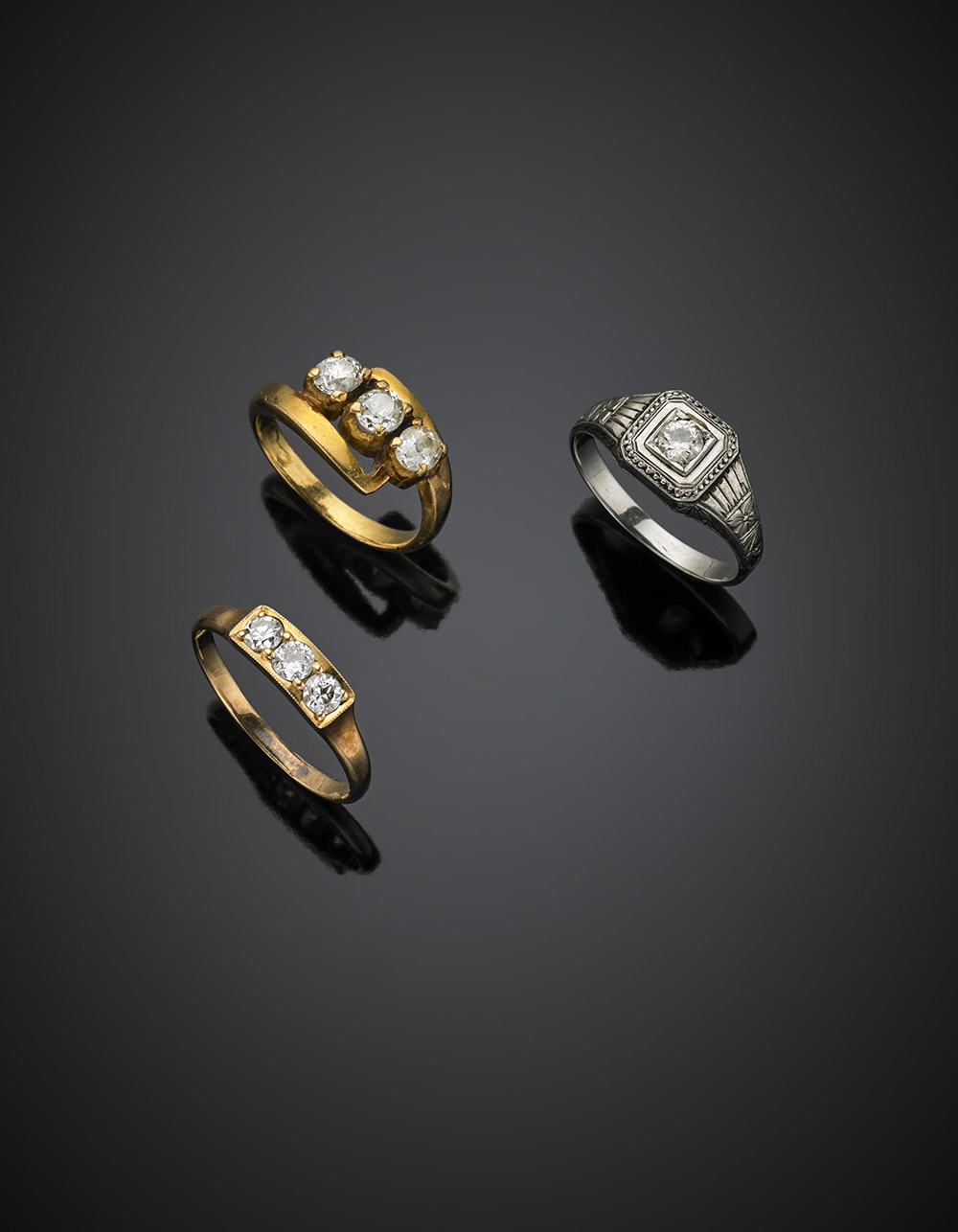 Tre anelli in oro giallo e bianco con diamanti di tagli diversi, complessivi g 8,47 misura 9/49 - 14/54.