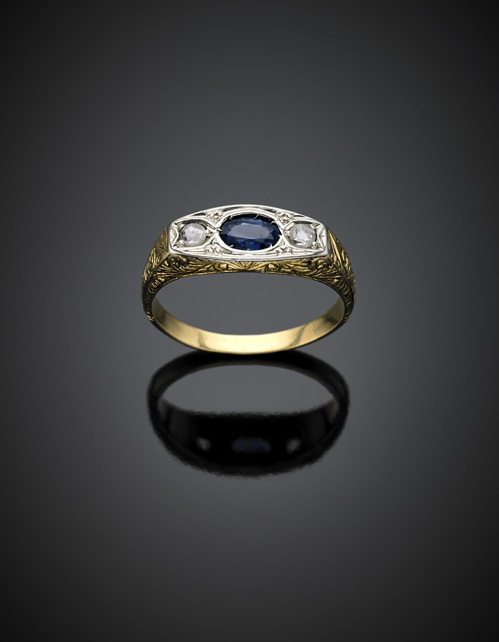Anello in oro giallo e bianco cesellato con zaffiro ovale e due diamanti mezza rosetta, g 7,8.