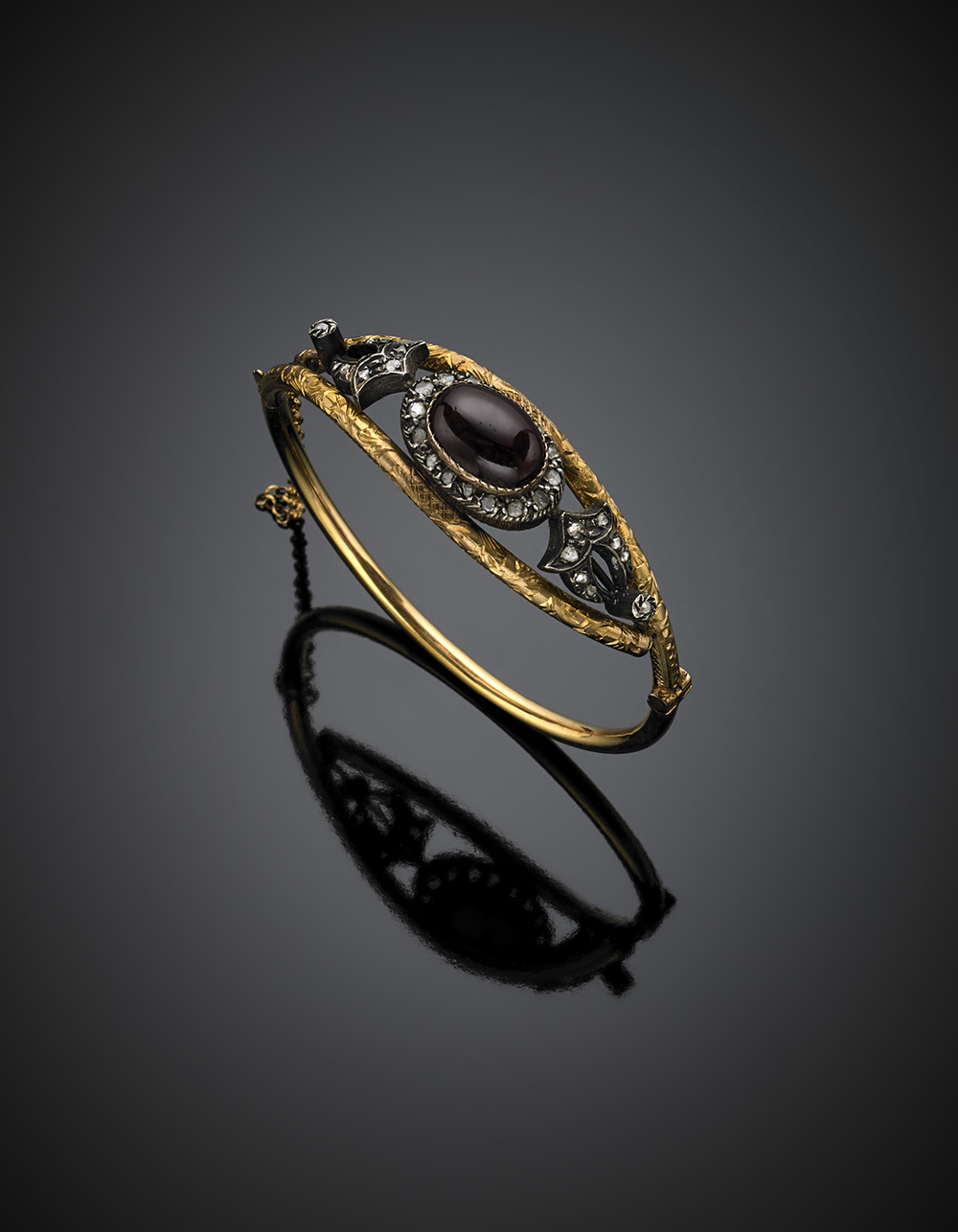 Bracciale rigido in oro giallo e argento con granato ovale cabochon di ct. 16 circa e diamanti a mezza rosetta, g 21,81, diam. cm 6,6.