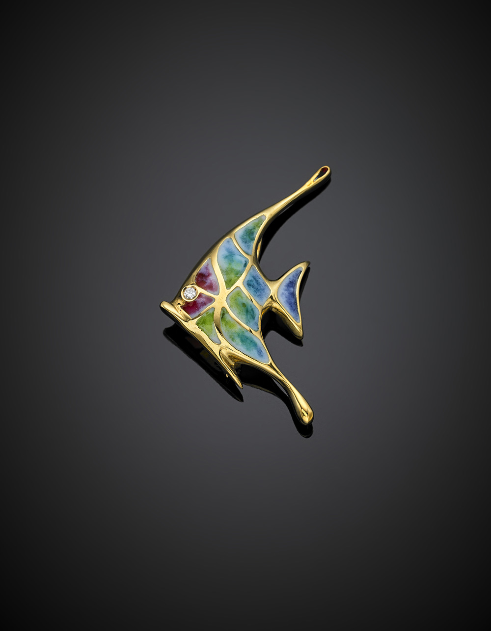 *Yellow gold plique-a-jour enamel fish brooch, g 8.42, length cm 5, width cm 3.5 circa.