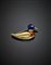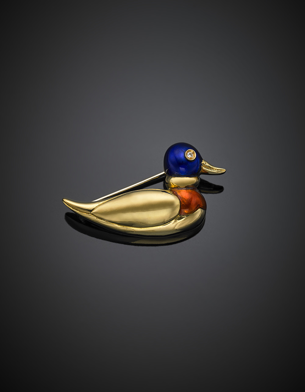 Spilla in oro giallo e smalti a guisa di anatra, g 7,43, lungh. cm 3,5 circa. Marcato 2721 MI.