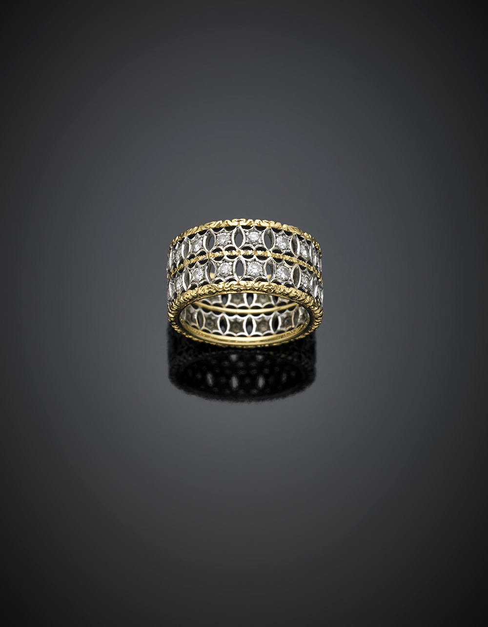 Anello in oro giallo e bianco traforato a pizzo con due file di diamanti per complessivi ct. 0,80 circa g 6,97 misura 11/51. In scatola di Mariani Gioielleria