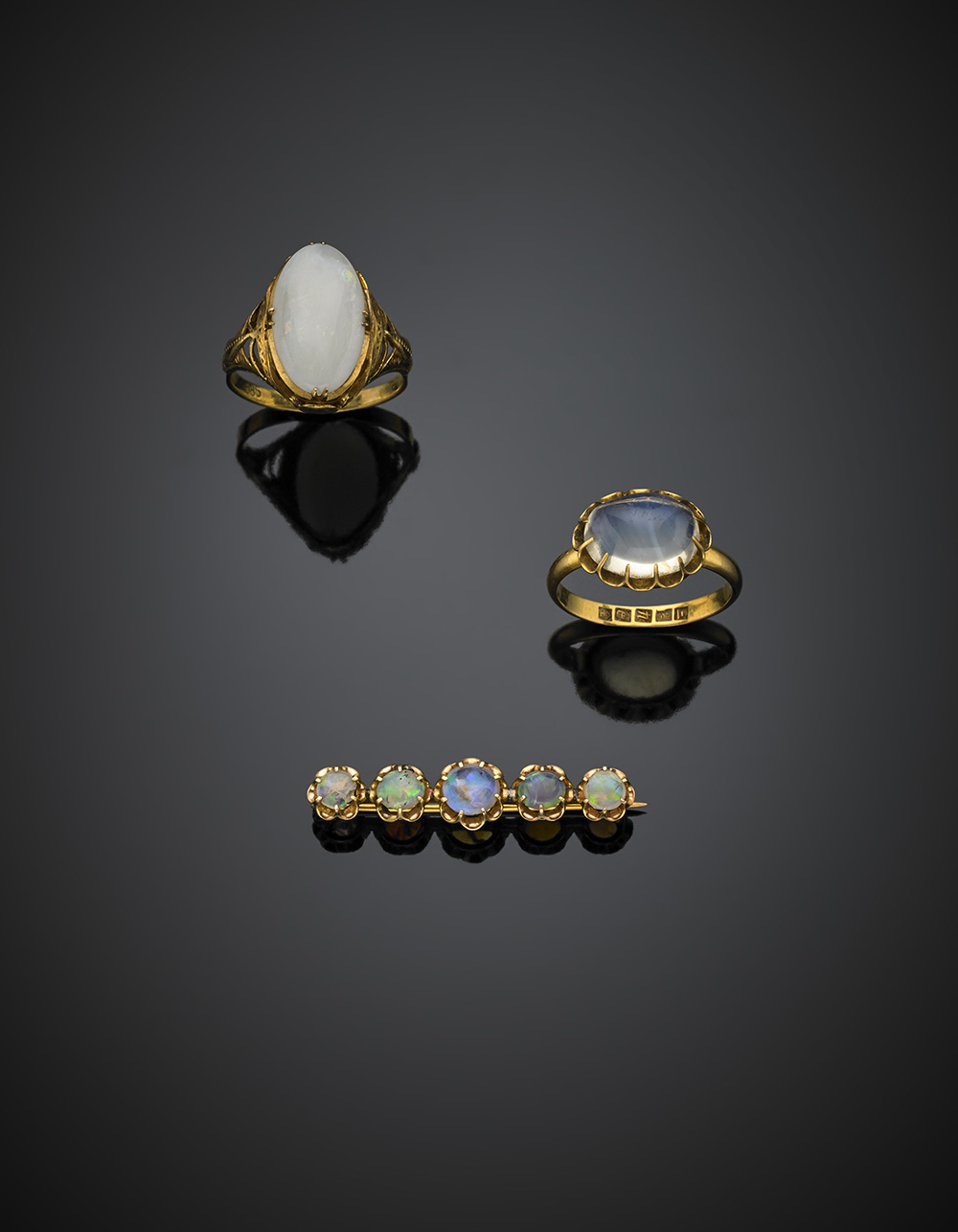 Lotto in oro giallo 750/1000 e 585/1000, composto da due anelli e una spilla con opali, complessivi g 10,45 misura 14/54, 16/56.