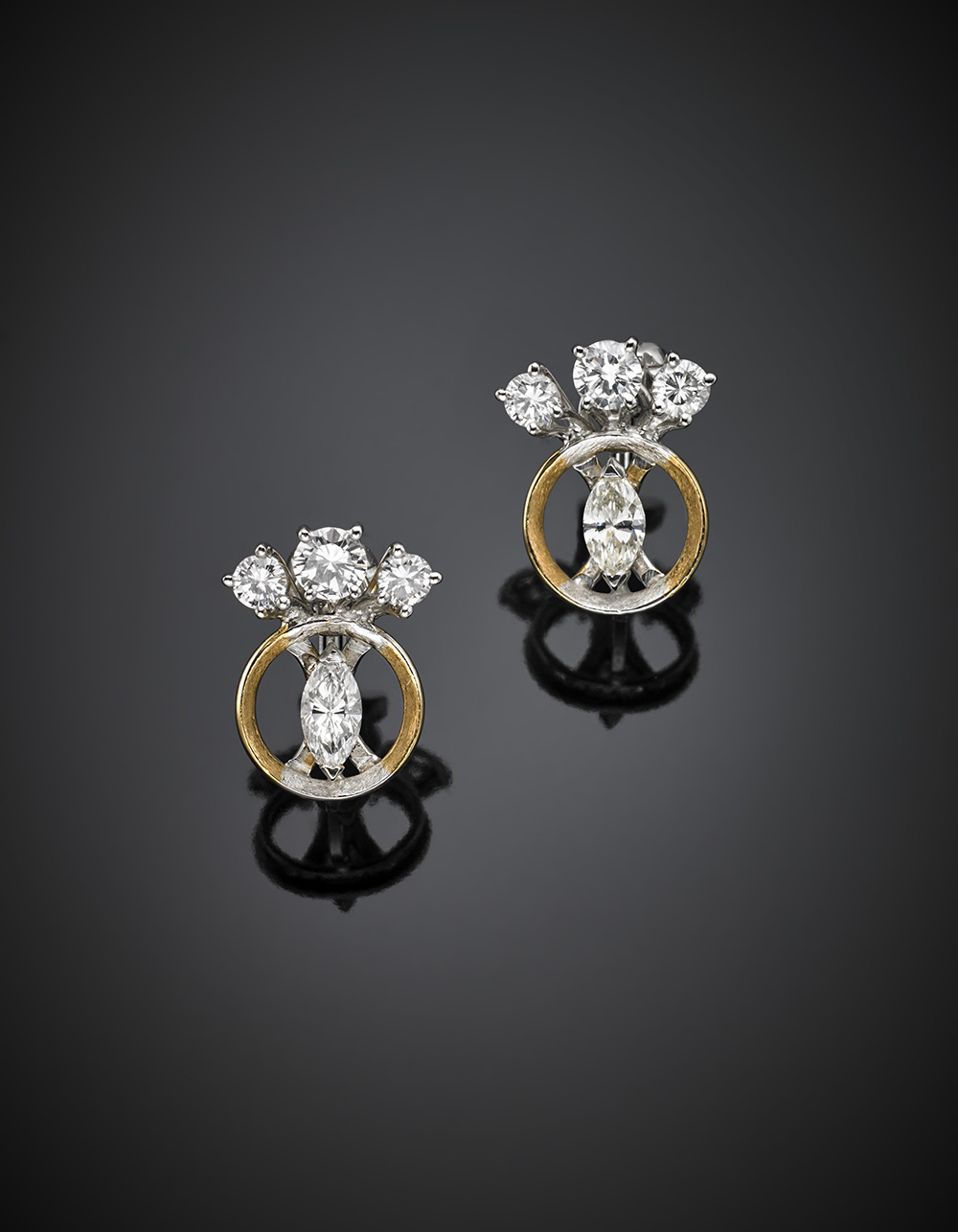 Lotto 1289 | Orecchini in oro bianco e giallo con diamanti rotondi e a navette per...