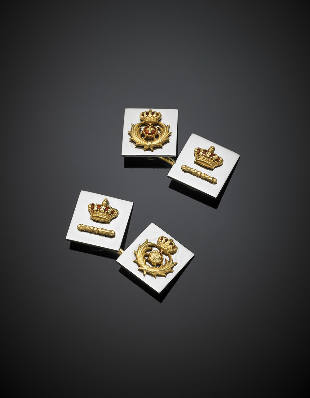Steel cufflinks with yellow gold and red enamel crests, g 8.24, diam. cm 1.2.
