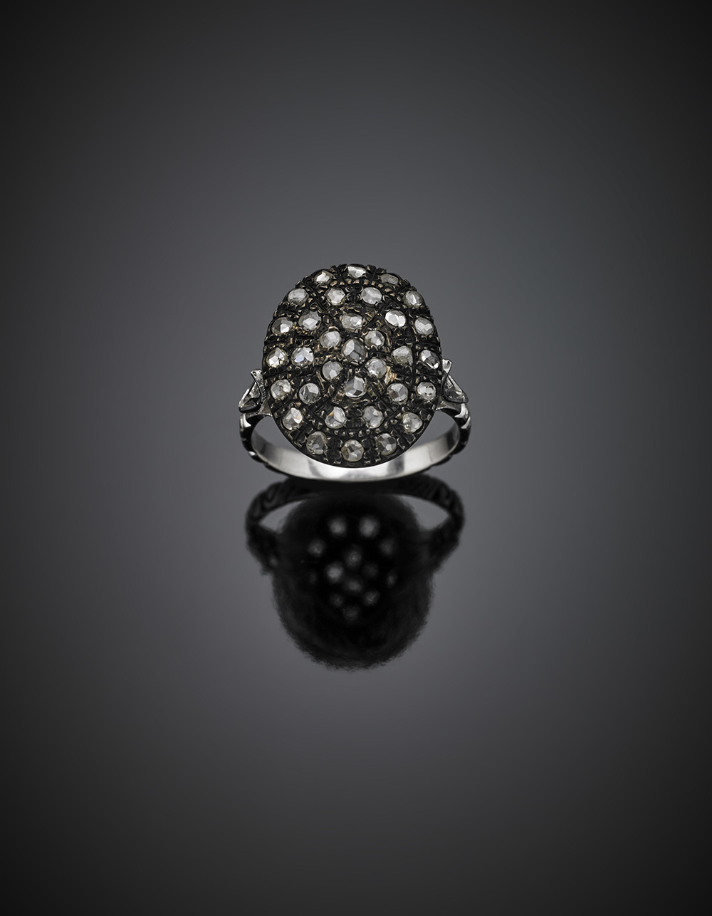 Anello in oro bianco e argento con pavé di diamanti a mezza rosetta, g 5,57 misura 18/58.