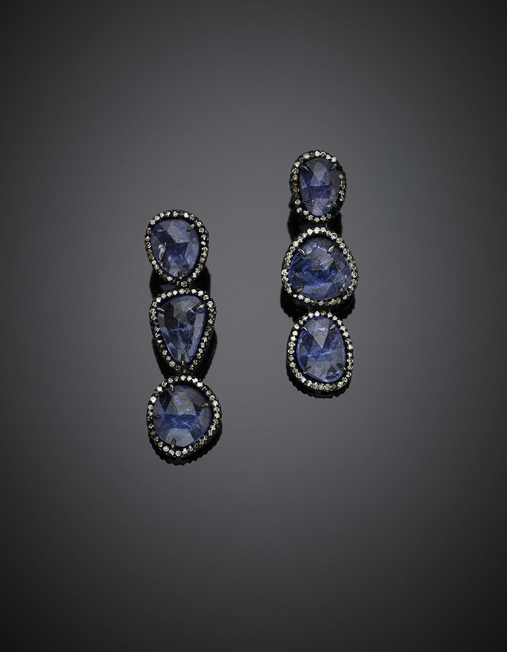Orecchini in oro e argento con diamanti e tanzaniti irregolari, g 11,05, lungh. cm 4,4 circa. (mancanze)