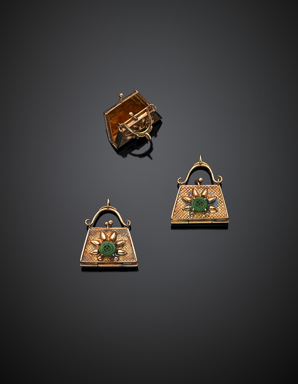 Lotto composto da tre charms a forma di borsette apribili in oro giallo 585/1000 e giada, complessivi g 14,28.