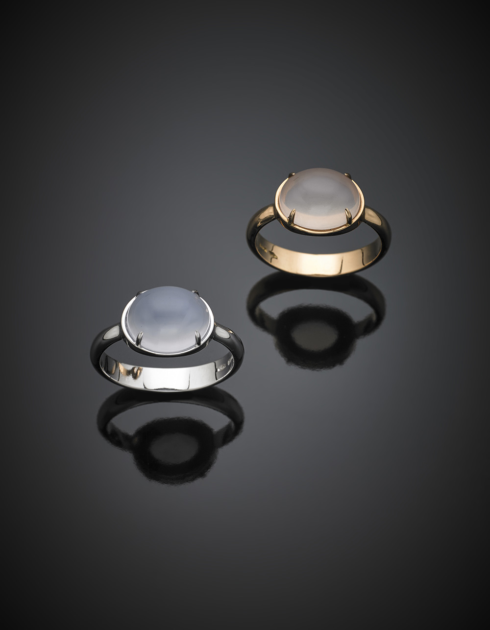 Lotto composto da due anelli in oro bianco e rosa, uno con calcedonio azzurro di ct. 2,75 circa misura 11/51 e uno con quarzo di ct. 3 circa misura 9/49, complessivi g 7,71. Marcato 2297 MI. Con garanzia originale