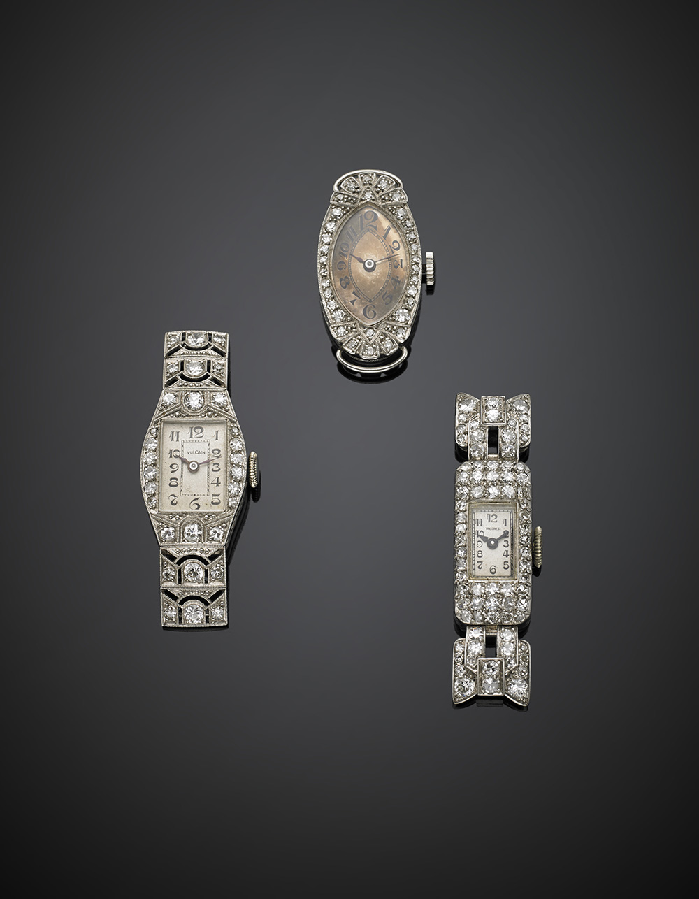 Lotto composto da tre orologini da polso da donna in platino e diamanti,...