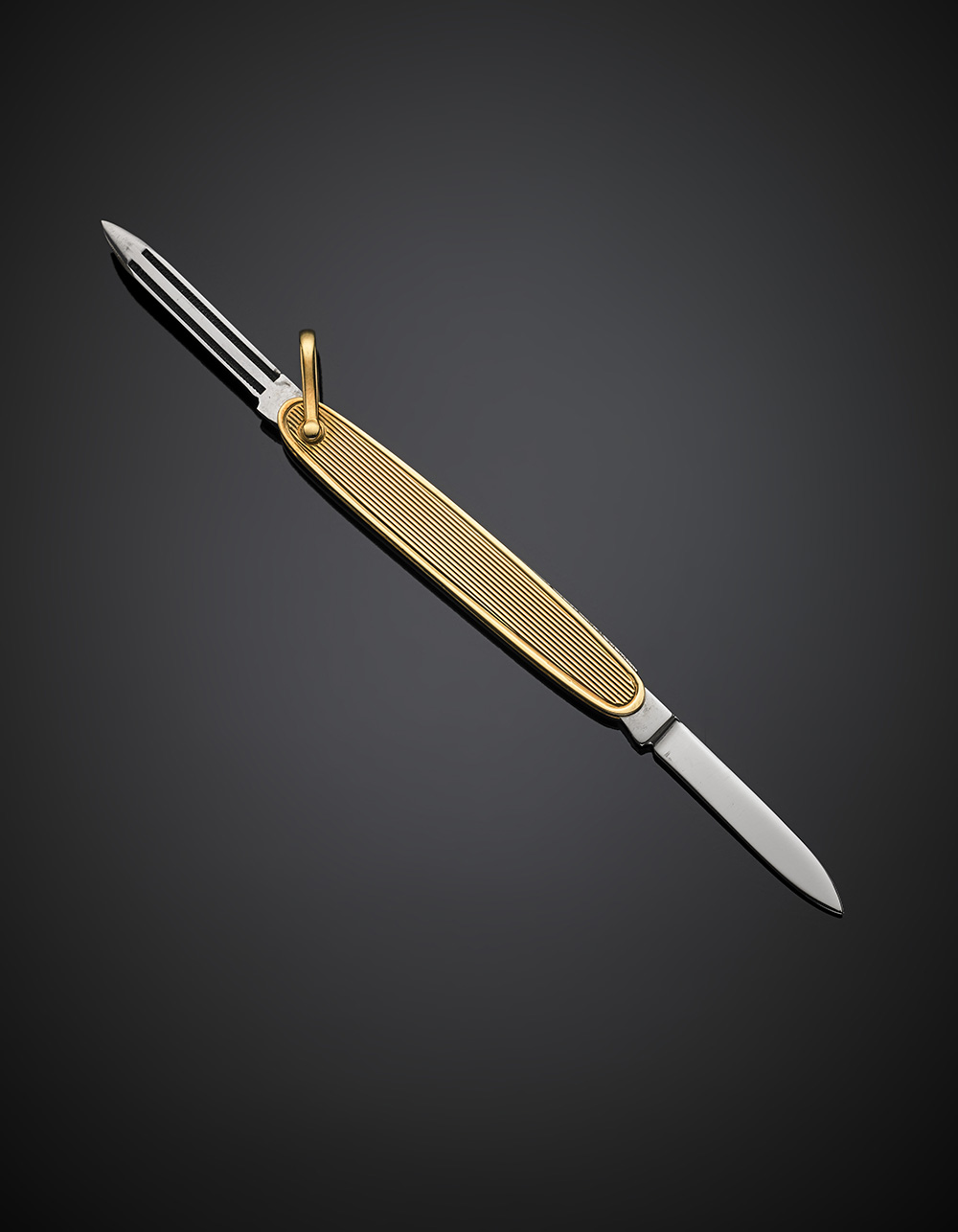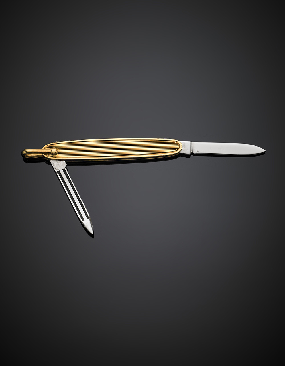 Coltellino da tasca in oro giallo rigato, lordi g 26,96, lungh. cm 7,5 circa.
