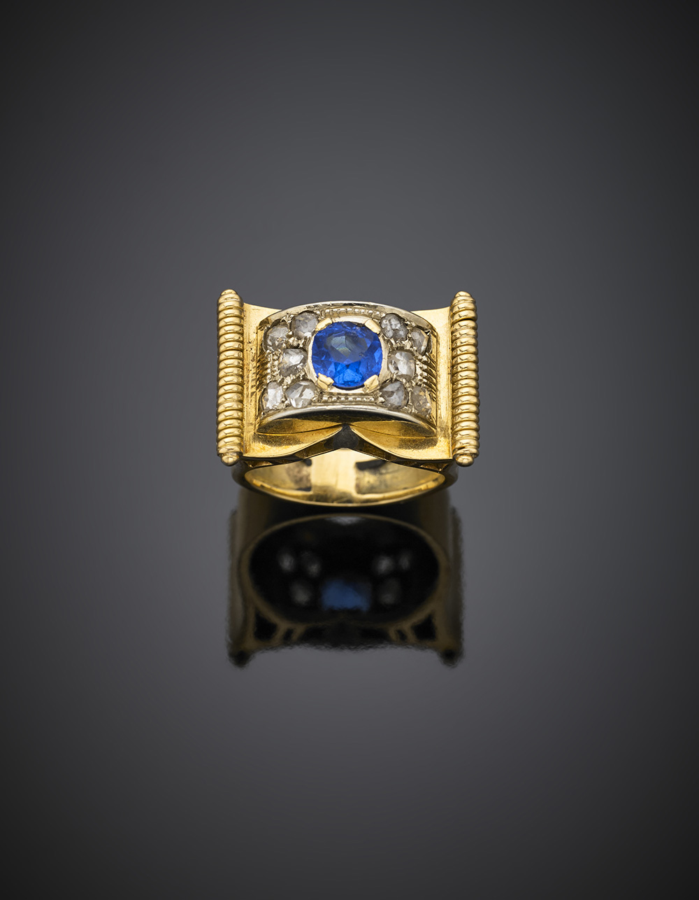 Anello in oro giallo a cartiglio con pasta vitrea rotonda blu rifinito con diamanti irregolari, g 11,28 misura 14/54. (difetti)