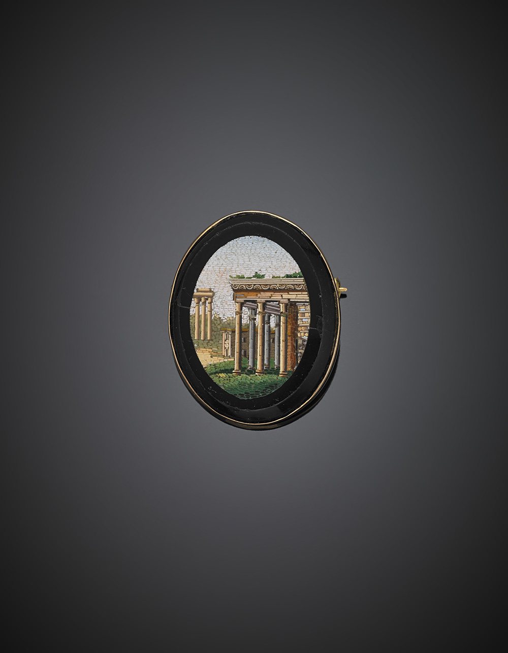 Spilla in oro giallo 500/1000 con micromosaico su onice, g 9,63, lungh. cm 3,2, largh. cm 2,7 circa. (difetti)