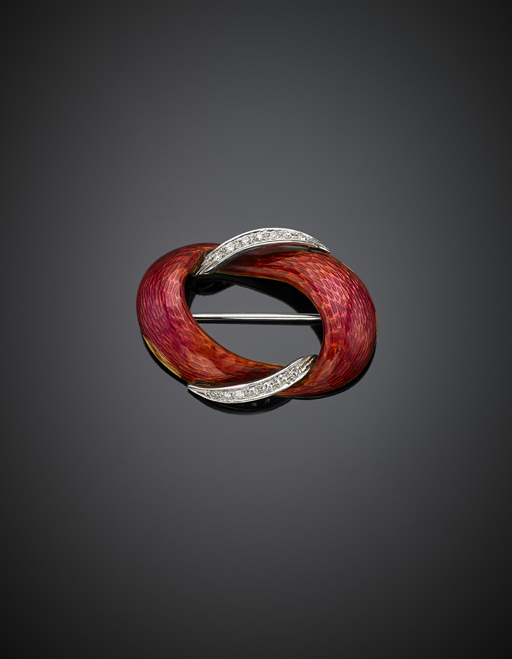 Spilla a nodo in oro giallo e bianco rifinita con smalto guilloché rosso e diamanti, g 8,64, lungh. cm 3,5, largh. cm 2,5 circa. Marcato 796 AL. (difetti)