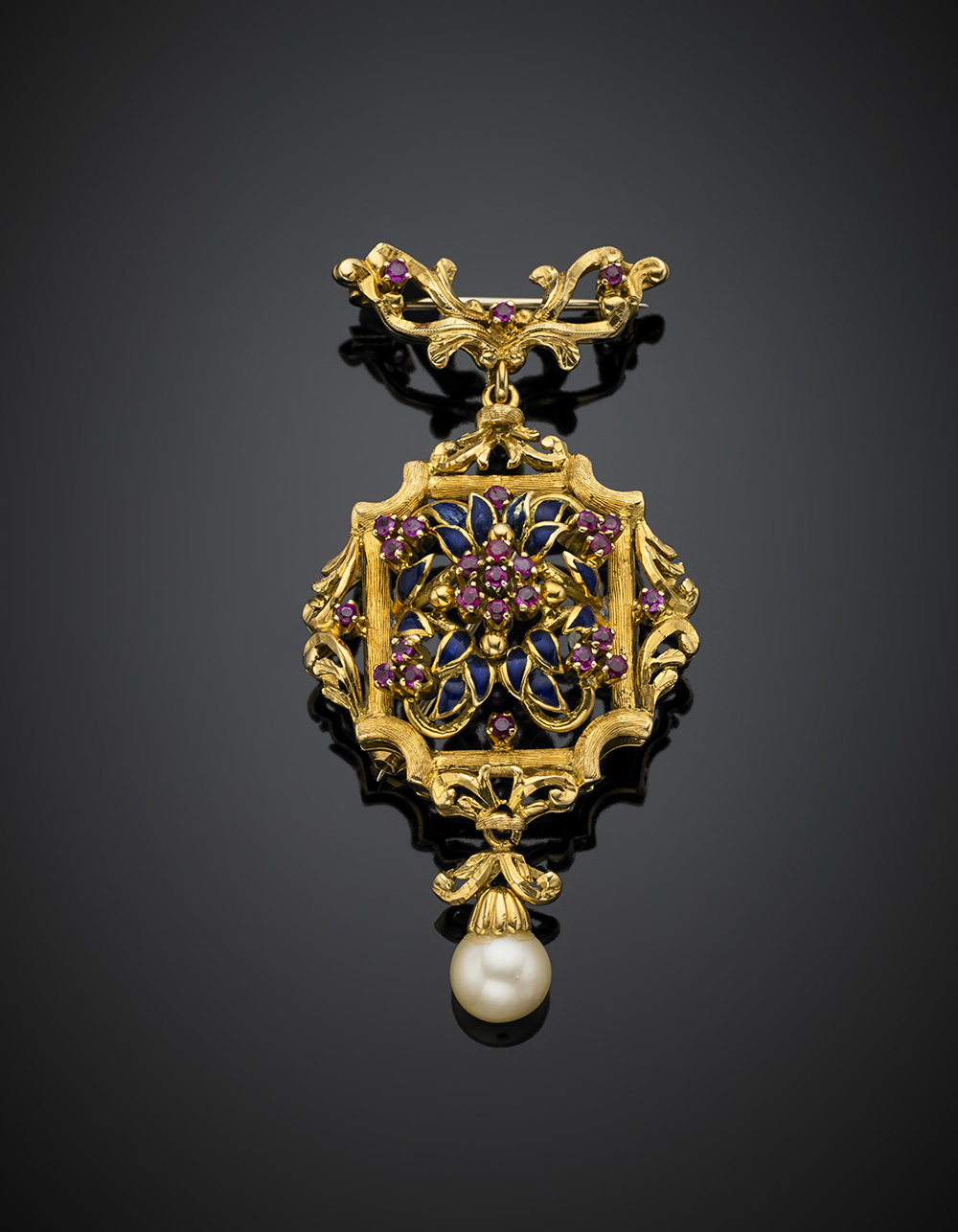 Yellow gold brooch with removable pendant, accented with blue enamel and rubies, g 16.67, length cm 6.20, width cm 3.10 circa.
