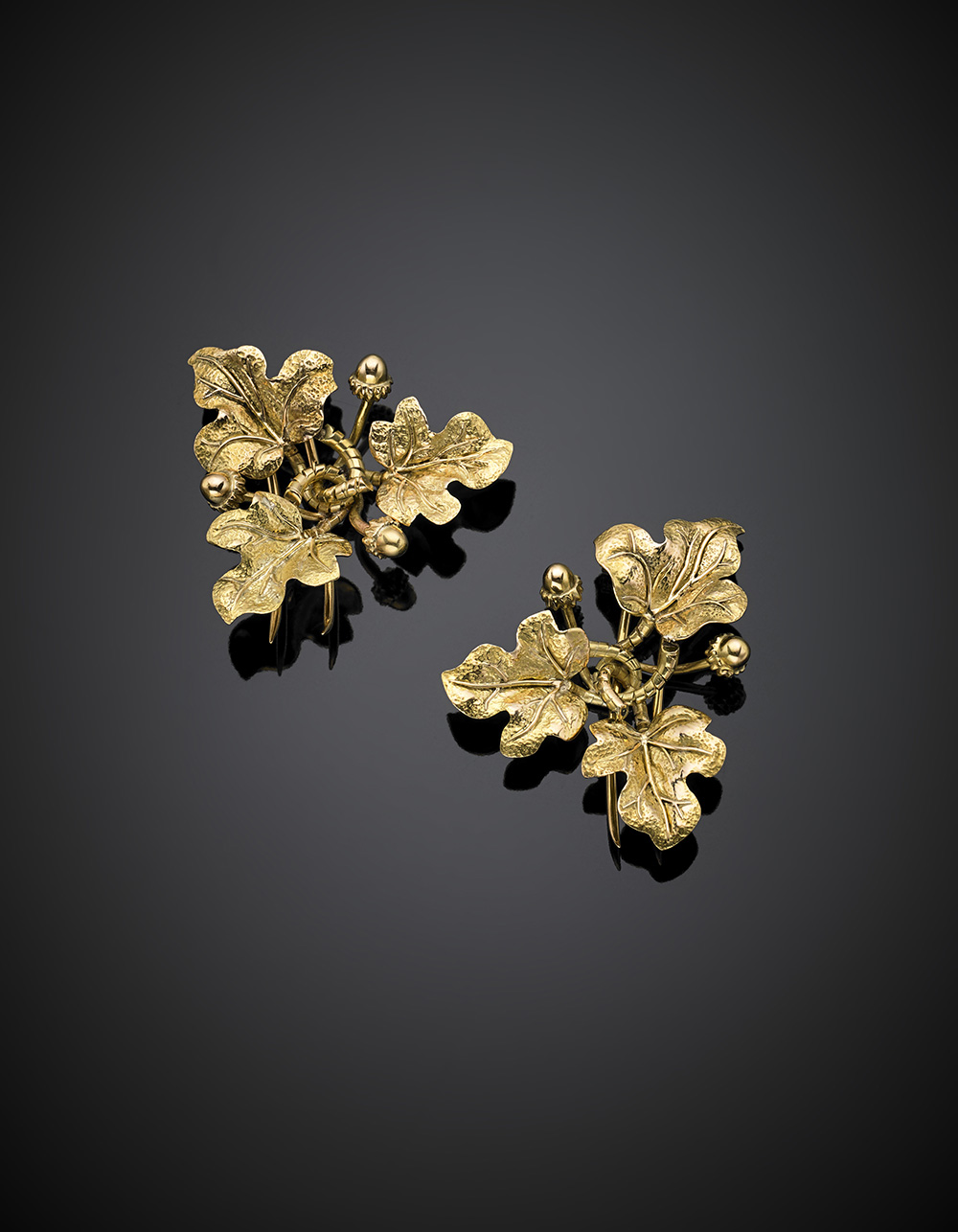 Coppia di broche in oro giallo a guisa di foglie di quercia e ghiande,...