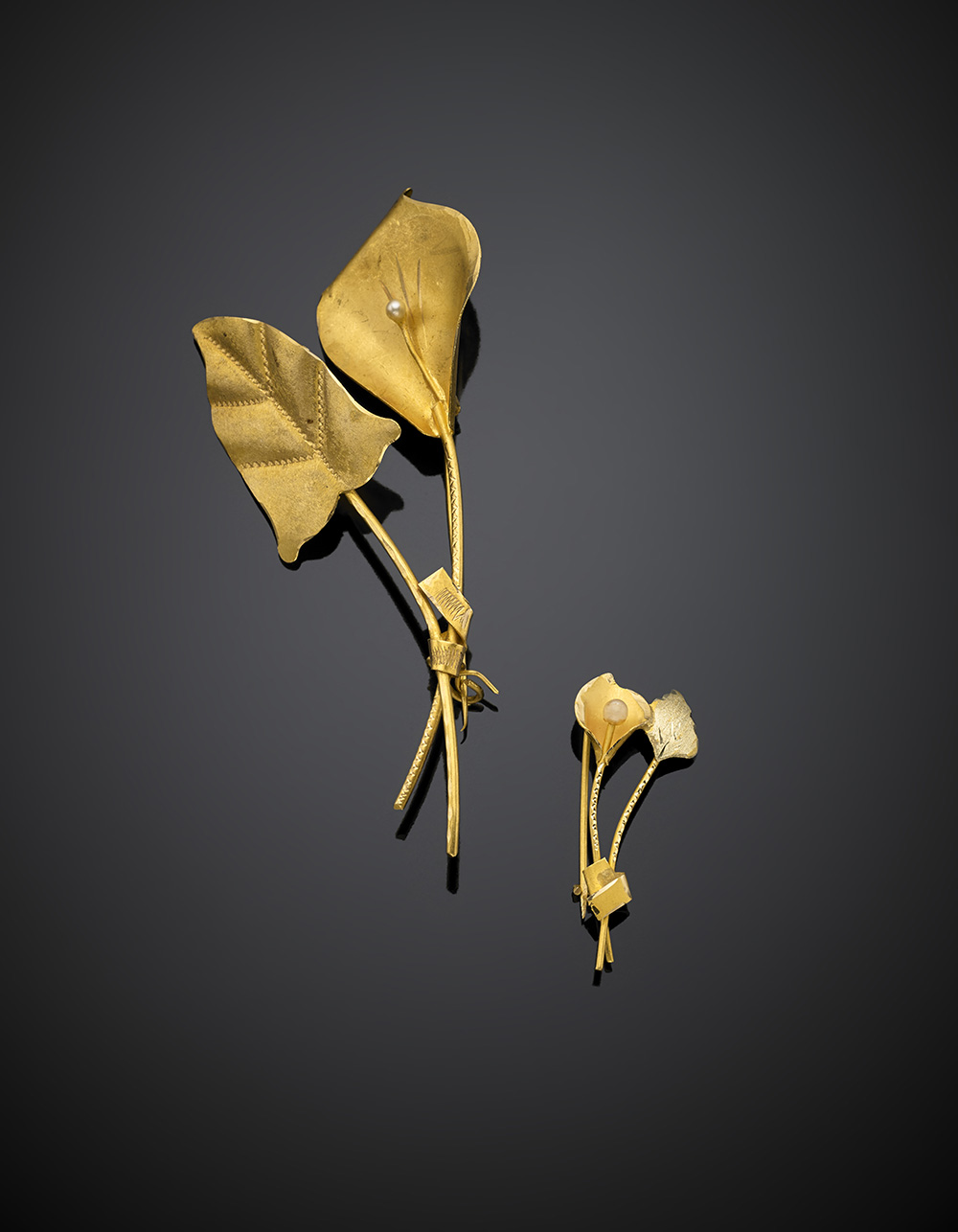Doppia spilla in oro satinato e lucido rifinita con microperle a guisa di foglia con fiore e nastro, complessivi g 12,98, lungh. cm 9, largh. cm 4 circa.