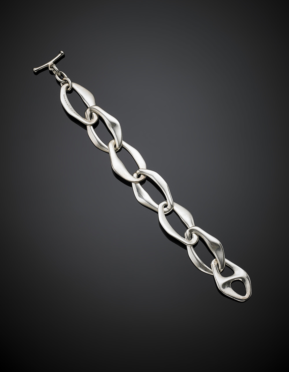Bracciale Aegean in argento con chiusura toggle, g 38,34, lungh. cm 20 circa. Firmato Tiffany & CO, Spain, Elsa Peretti.