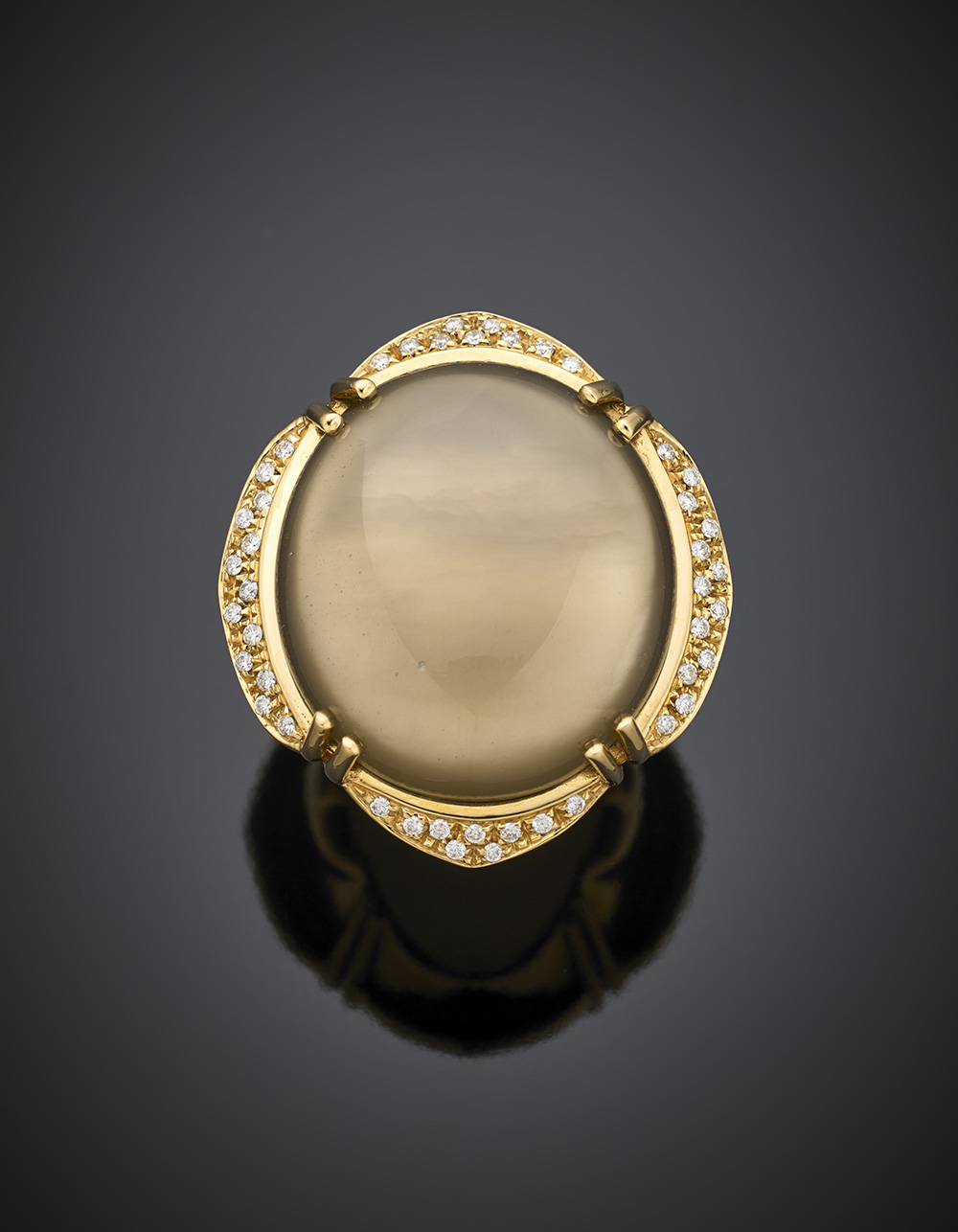 Anello in oro giallo con grande pietra composita di madreperla e quarzo fumé, rifinito in diamanti, g 21,50 misura 14/54. Firmato Brusidue.