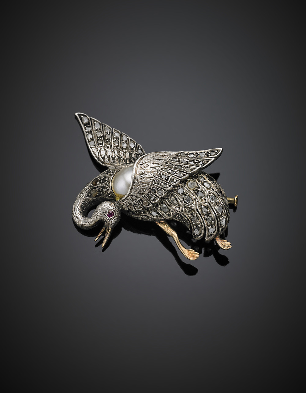 Spilla in argento e oro giallo rifinita con diamanti a mezza rosetta e perla a guisa di cigno, un rubino per l'occhio, g 7,81, lungh. cm 4,5, largh. cm 2,5 circa.