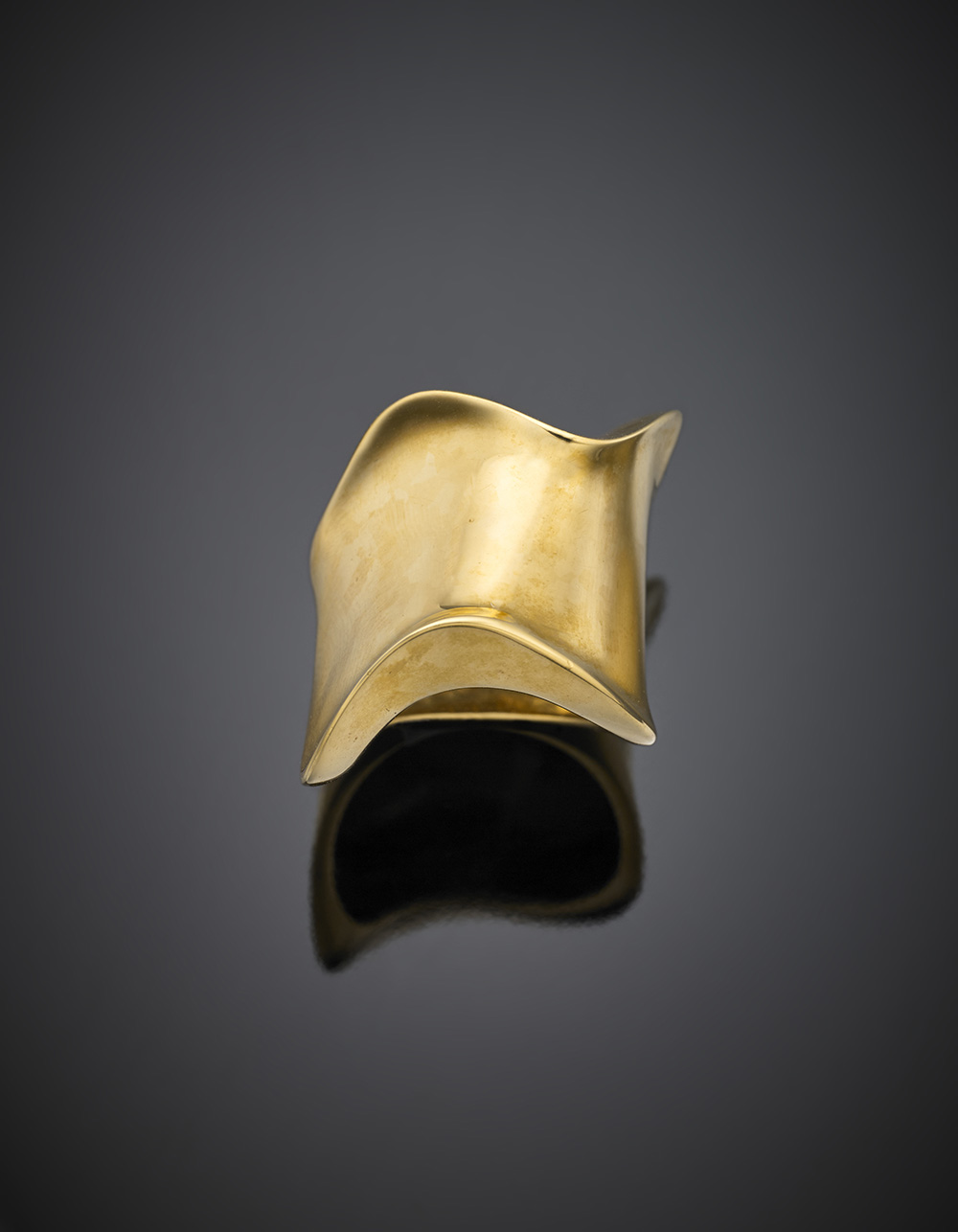 Anello in oro giallo a fascia ondulata, g 15,66 misura 16/56. Marcato P. Wong.