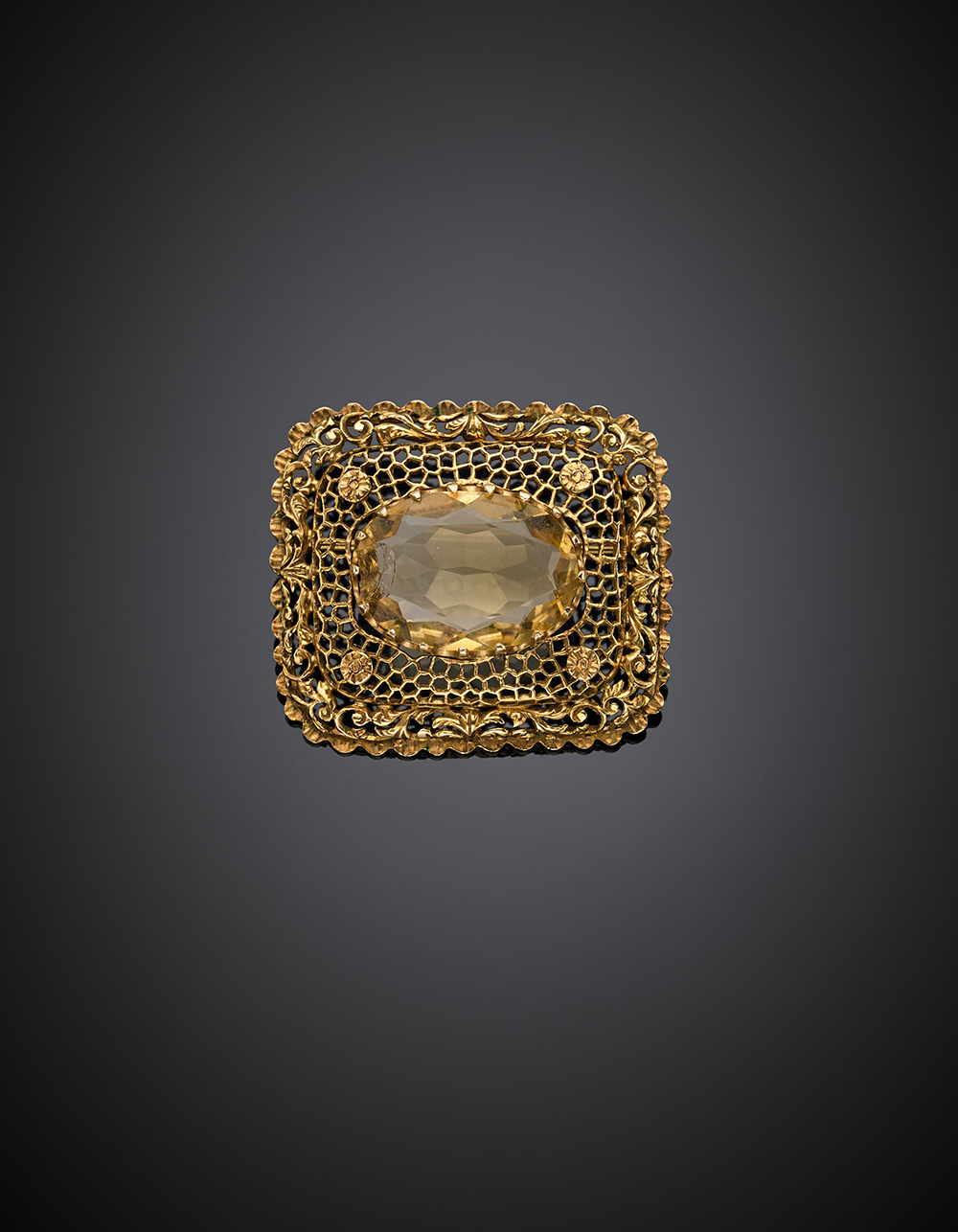 Spilla traforata in oro giallo e quarzo citrino di ct. 12 circa, g 10,37, lungh. cm 3,7, largh. cm 3,5 circa.