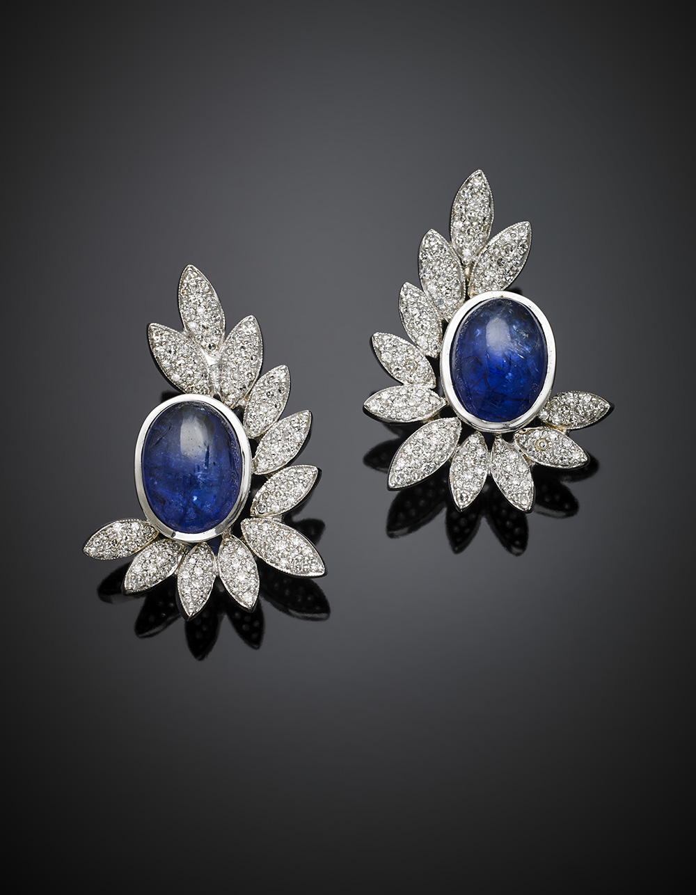 Orecchini a lobo a guisa di foglie e fiori in oro bianco con tanzaniti ovali cabochon e diamanti per complessivi ct. 2,50 circa, g 25,79, lungh. cm 4,5, largh. cm 3 circa.