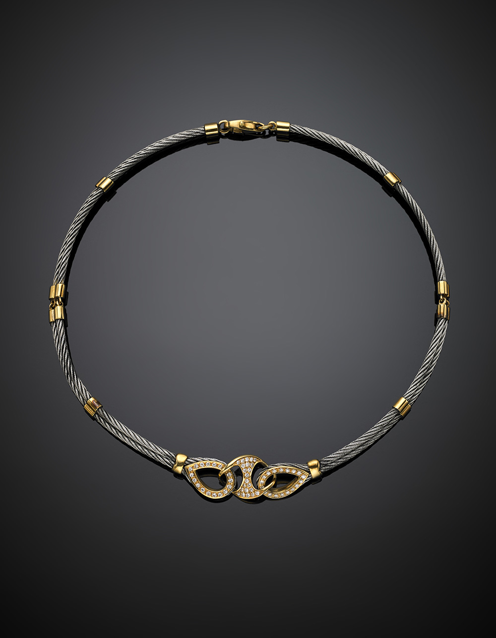 Steel and yellow gold articulated necklace accented with diamonds in all ct. 1 circa, g 31.17, diam. cm 13. Marked 155 MI, Scarabeo.