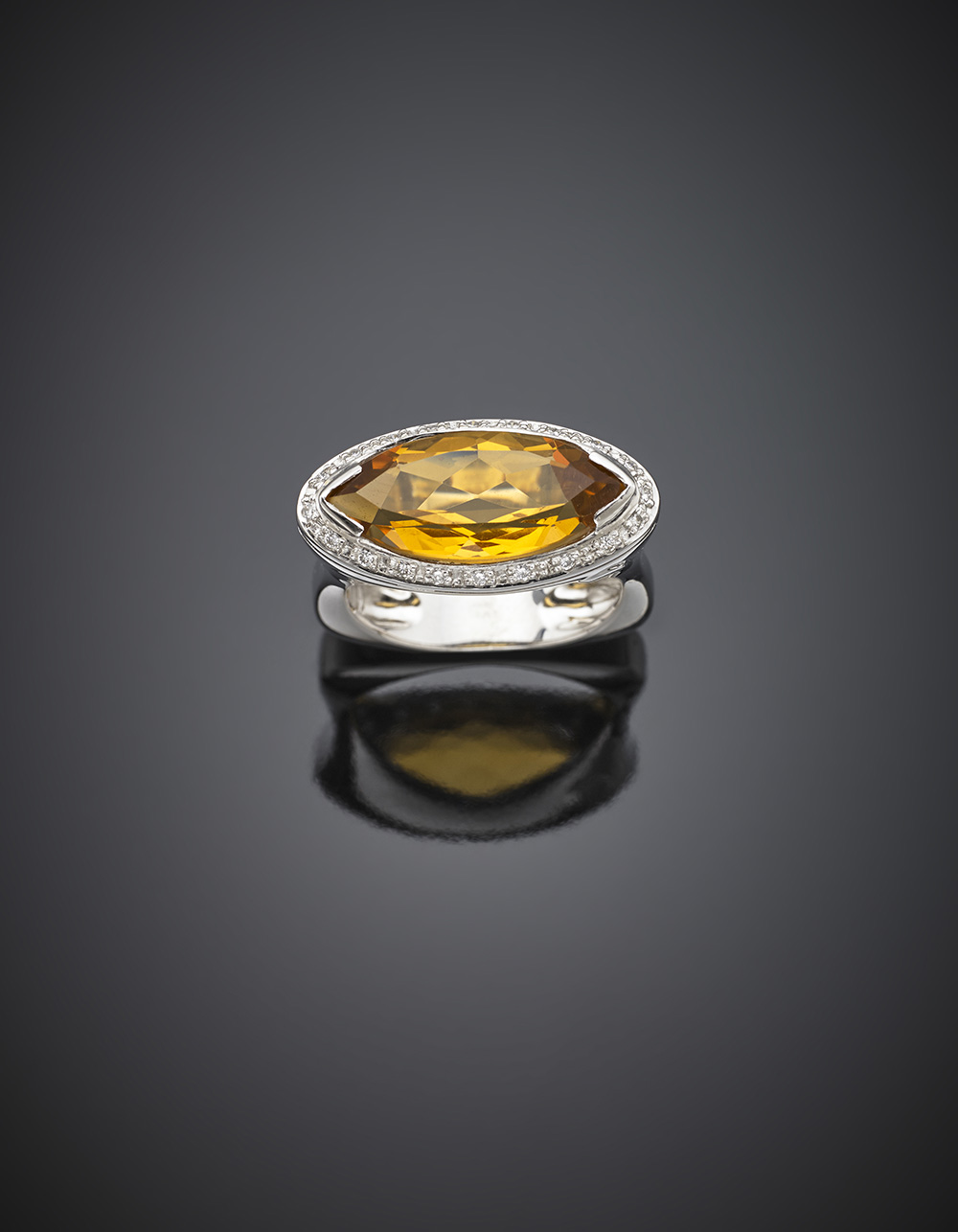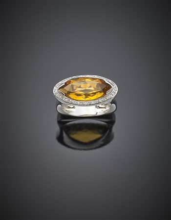 Anello in oro bianco con quarzo citrino a navette di ct. 3,80 circa e piccoli diamanti a rifinirlo, g 9,17 misura 12/52. Marcato PVG.