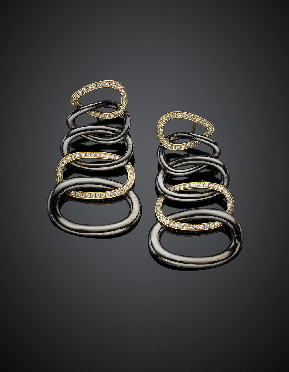 Orecchini pendenti in oro giallo, in parte rodiati nero, con diamanti, una...