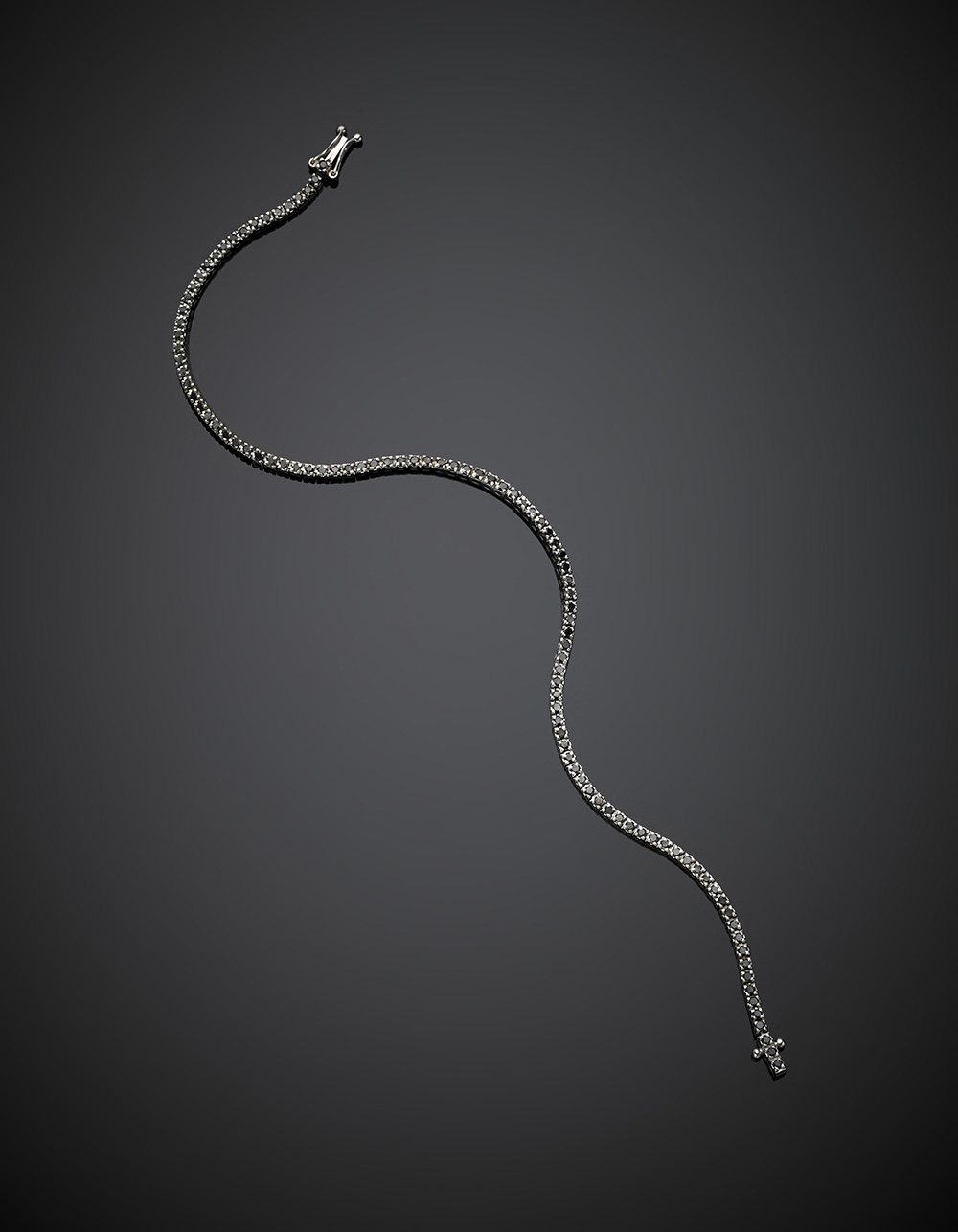 Bracciale tennis in oro bianco e diamanti neri per complessivi ct. 2,04 circa, g 7,26, lungh. cm 20,50 circa. Marcato 2297 MI. Con garanzia originale