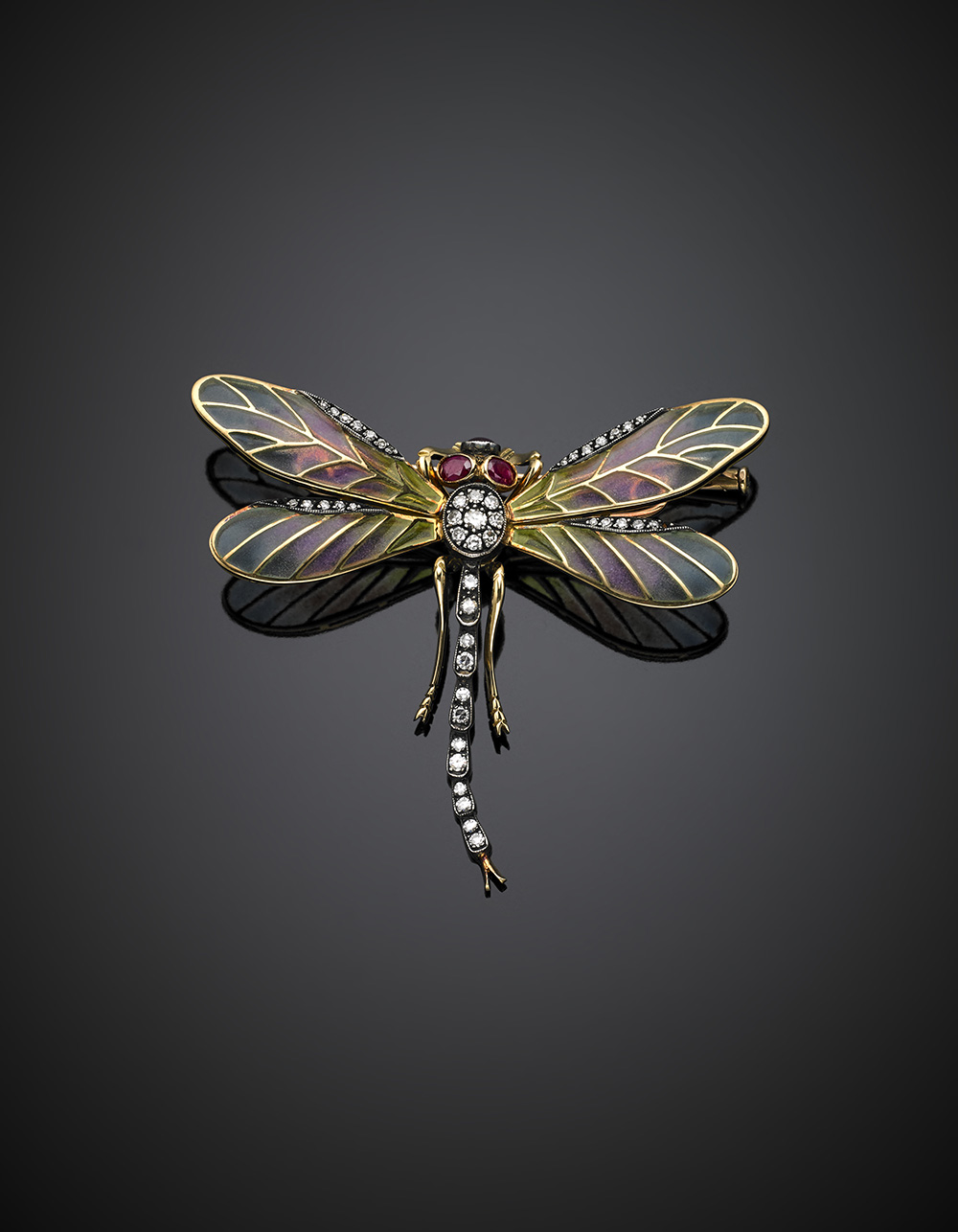Spilla in oro giallo e argento a guisa di libellula rifinita con smalti plique-à-jour, rubini e diamanti, g 13,31, lungh. cm 5,20, largh. cm 6 circa.
