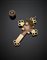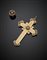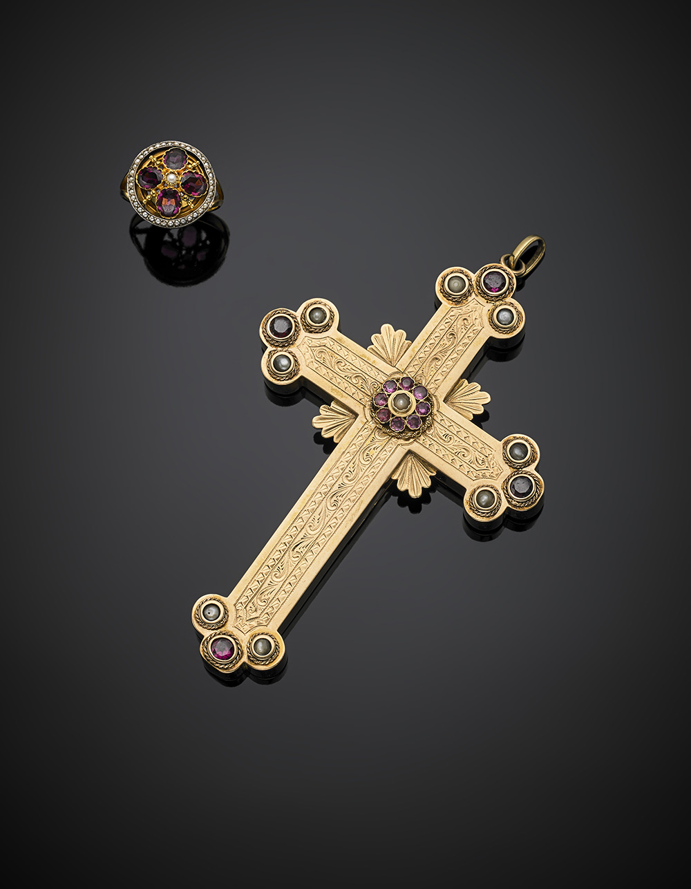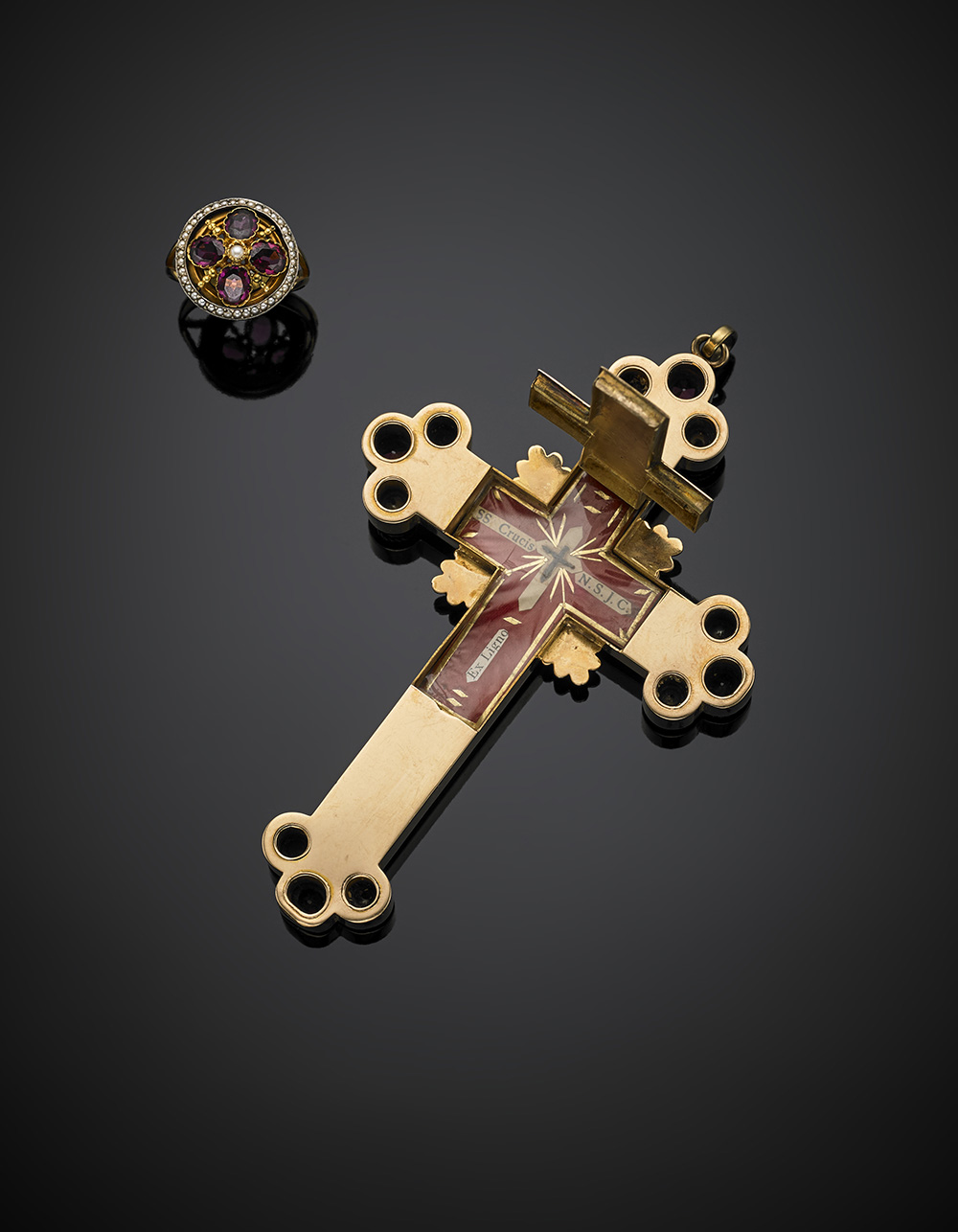 Yellow gold seedpearl and garnet lot comprising a chiselled cross Reliquary with a splinter of the Holy Cross, a scratched inside inscription, and a ring, in all g 79.56.